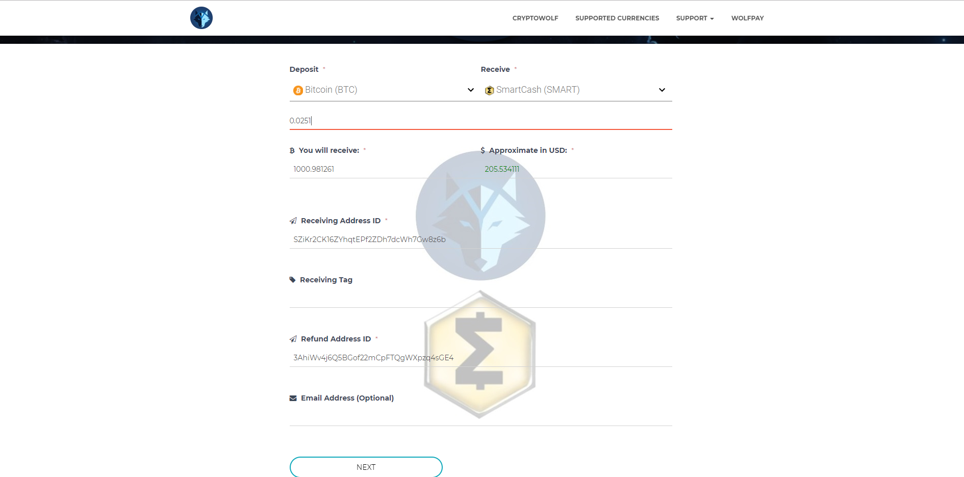Step2: navigate to cryptowolf's interface for buying SmartCash