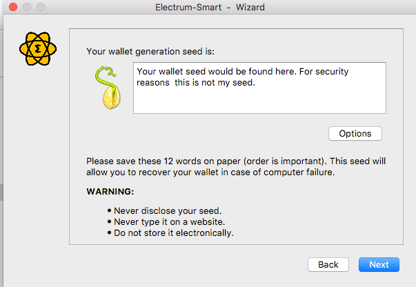 Once you click Next you all be shown this screen, you will be presented with your Seeds, take time to back it up like what we earlier started on this post, use your preferred back up options.Click on Next to continue