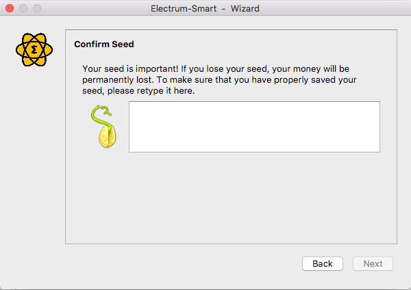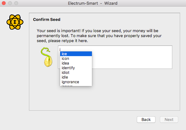 You will be asked to type in your seed here.Note that this process is to check if you have really back up your seeds and not playing too smart and stupid same time, cause once shown your set ups are complete, one might forget to back it up and a risk to one's funds - so once the seed confirmation shows up, you have to input the words manually, You will not be able to copy and paste in the box The system will present words for you to choose from as you start to type in your seed.