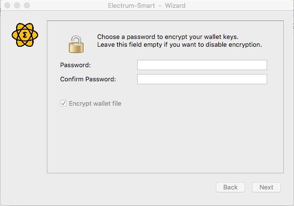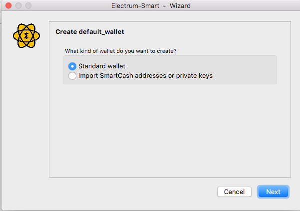 Select Standard Wallet to create a new wallet.Use the Import SmartCash address or private keys option to bring in your existing smartcash wallet into the electrum wallet. Click on Next to continue.