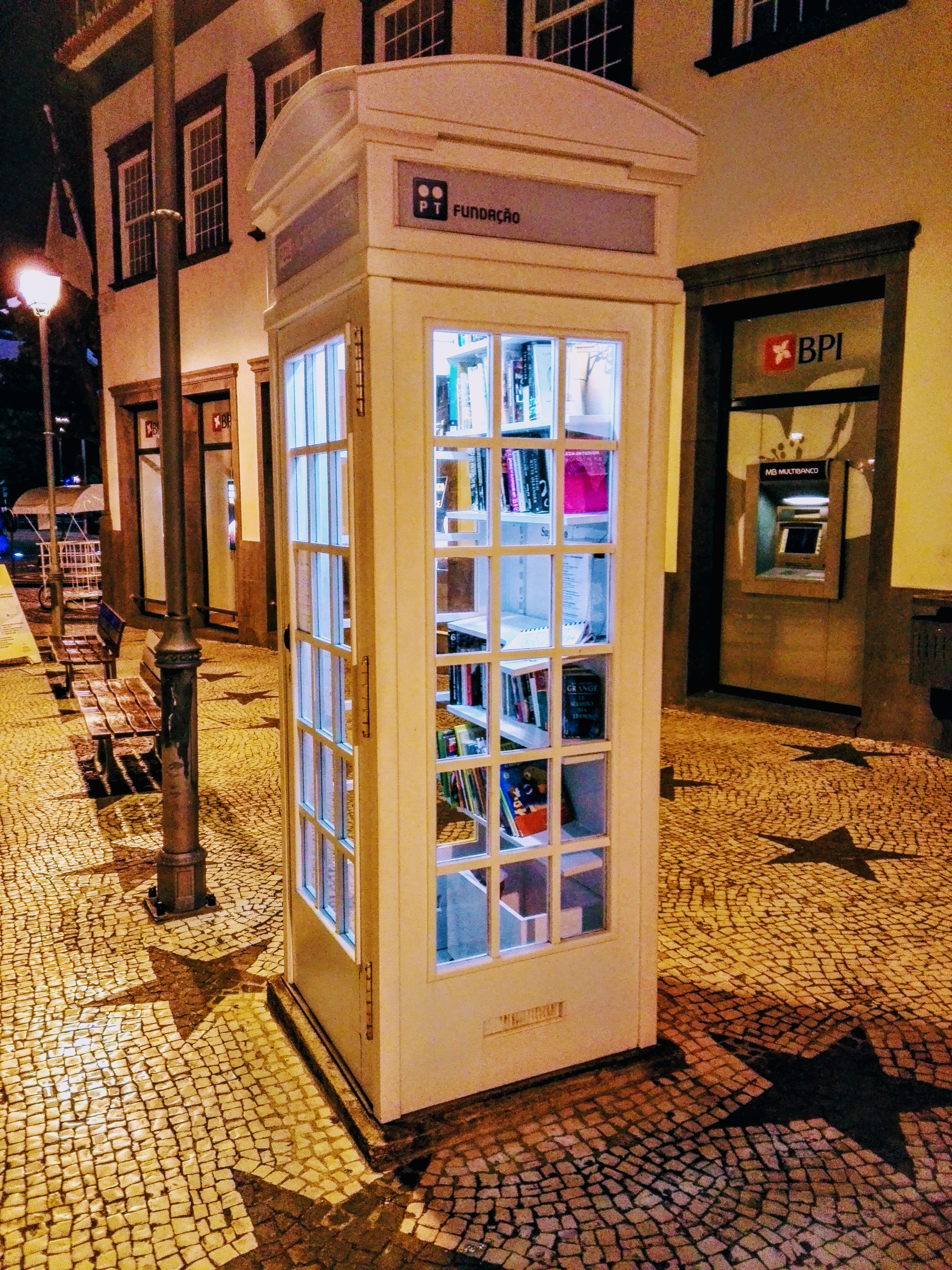 Small and peculiar library with the appearance of a telephone booth located in the historical center of Ponta Delgada city available to the public at any time of the day or night. The benches near by invite's you to sit and read