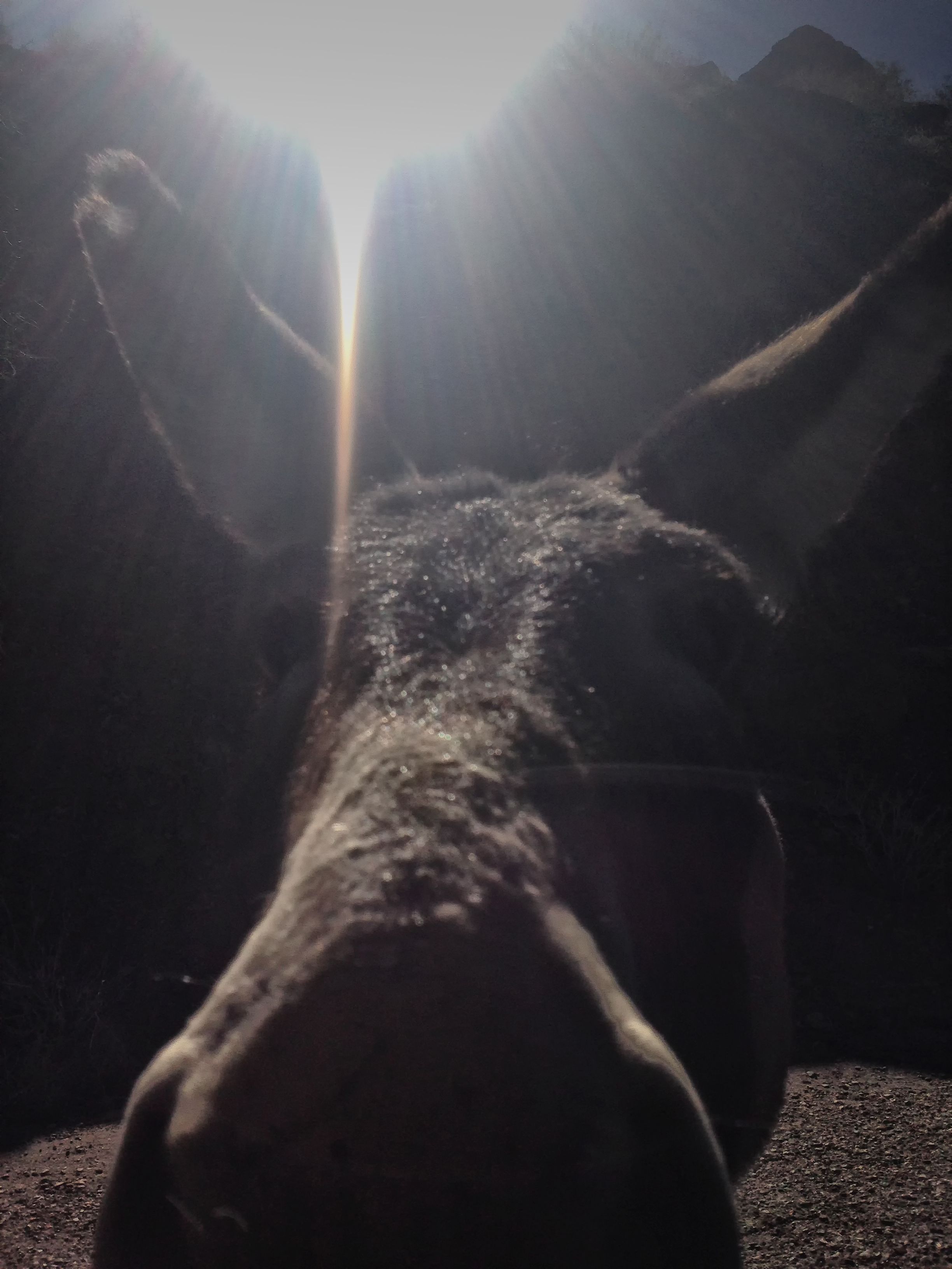 The burros here in the California desert are wild but curious. This one came up to my car window and poked her head inside while I snapped this photo on my iPhone. The bright sun backlit the frame highlighting an X on her ears and nose.