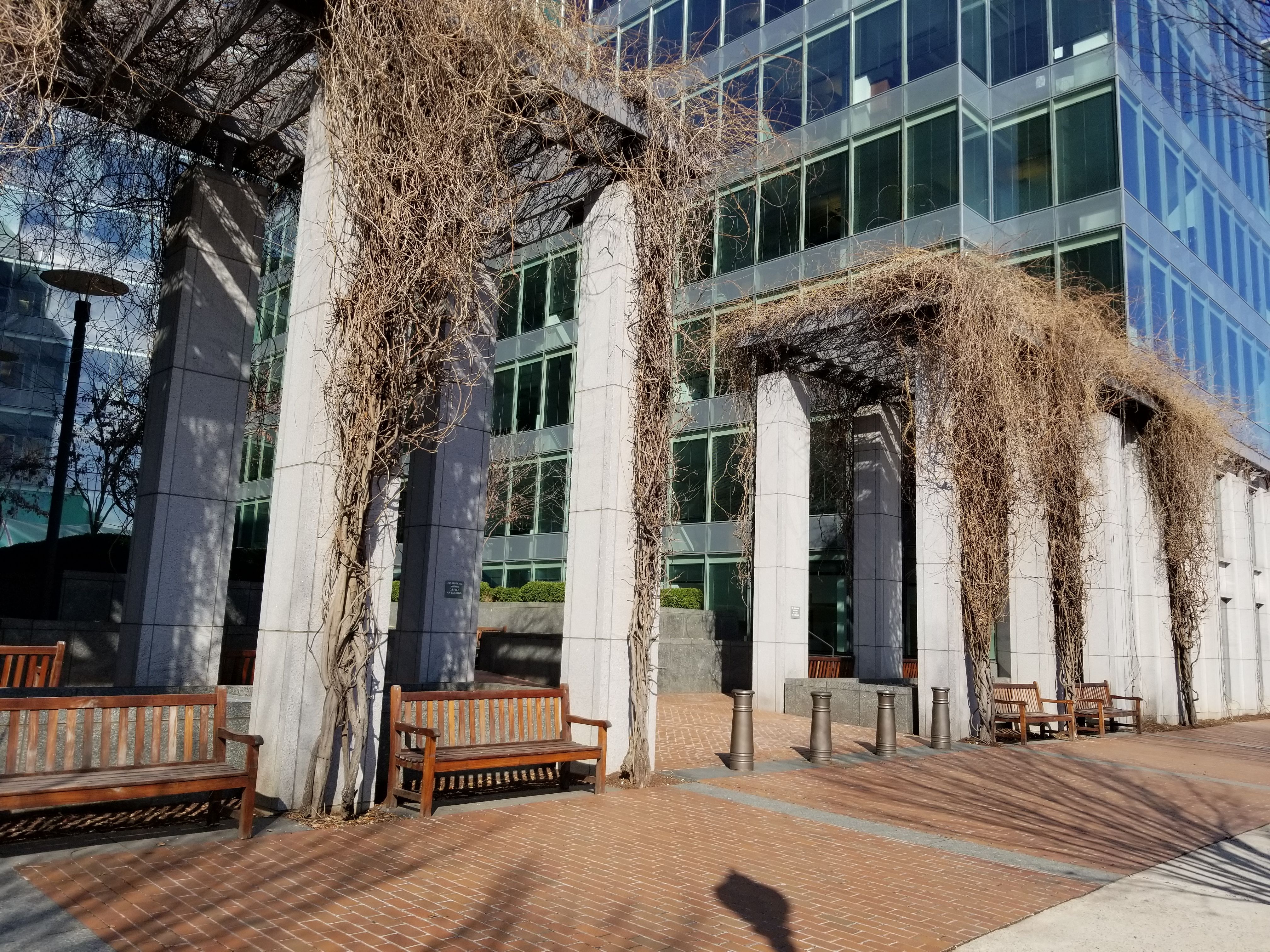 With those wood-style benches set up and weeds on the pillars made these place even more comfortable to stay in or relax.