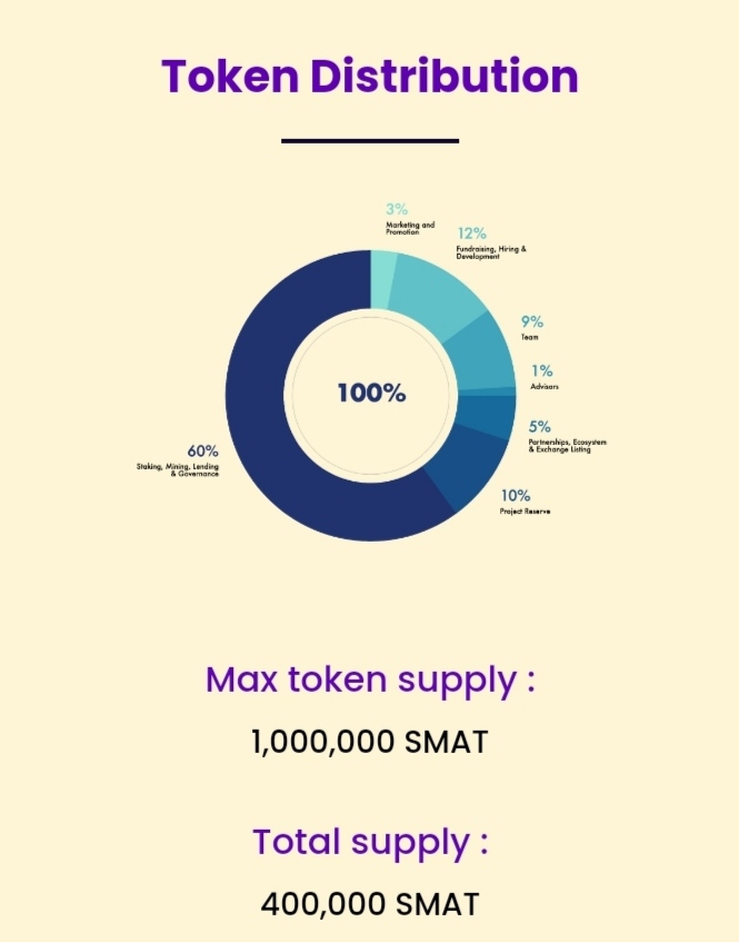 SMAT is the official token of Smarts Finance ecosystem. It is an Etherum ERC 20 based token and the basis of transactions and rewards. Holders of SMAT participate in the governance control voting in Smarts community.