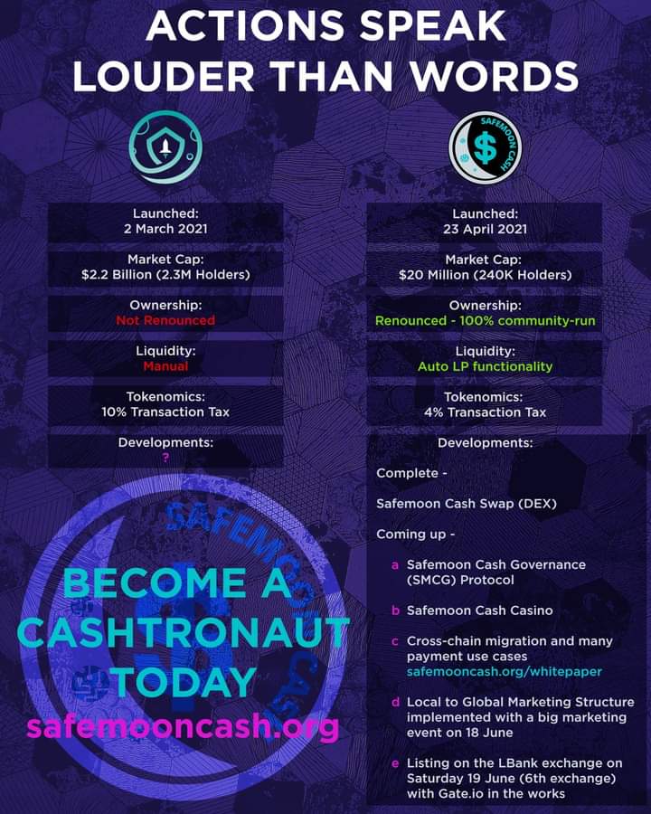 Guys, I'm so glad to introduce you guys to a HIDDEN GEM I just discovered, safemoon cash is a rug proof and ownership renounced community based token established on Binance Smart Chain with diverse use case. It is no gainsaying that meme coins in recent time has performed beyond expectations of many cryptocurrency enthusiasts, example is DOGE Coin which has moved to ATH of $0.67 some months ago. Who ever think or expected such spontaneous growth!