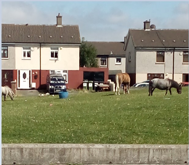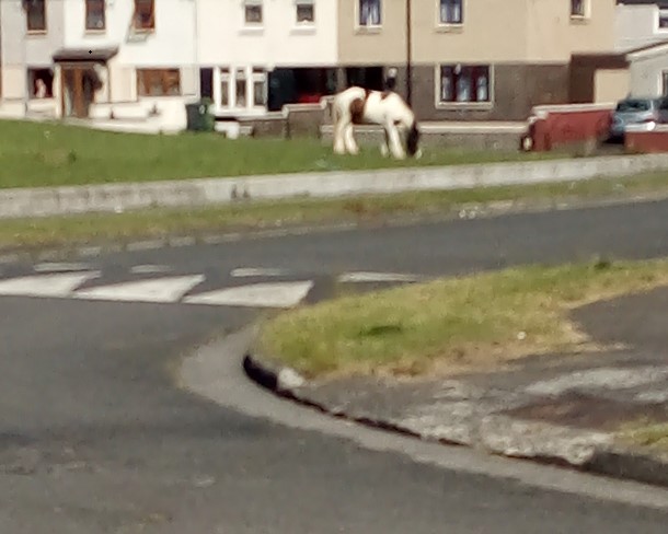 You can see this turn on the right in the previous picture. as I reached that. Oh looky there. A horse on the green, not very unusual around here. Some find it a novelty though. A few more steps down to the other end of the green and yup a few more. Well a horse and two pony's.