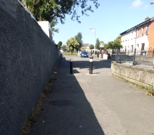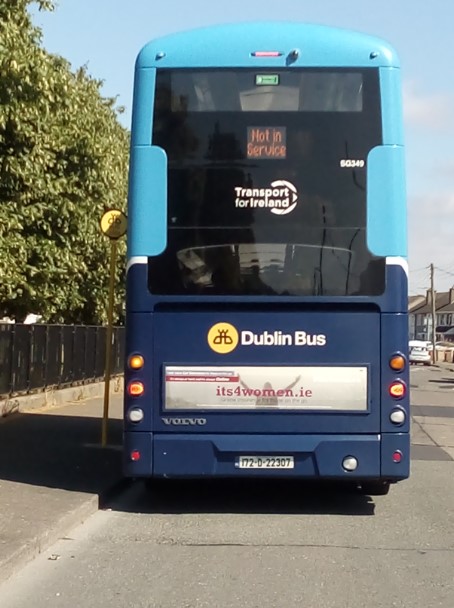 Need to get across this road to get to the park to my right there is a bus parked, If you haven't seen the back of a Dublin bus, This is what one looks like.