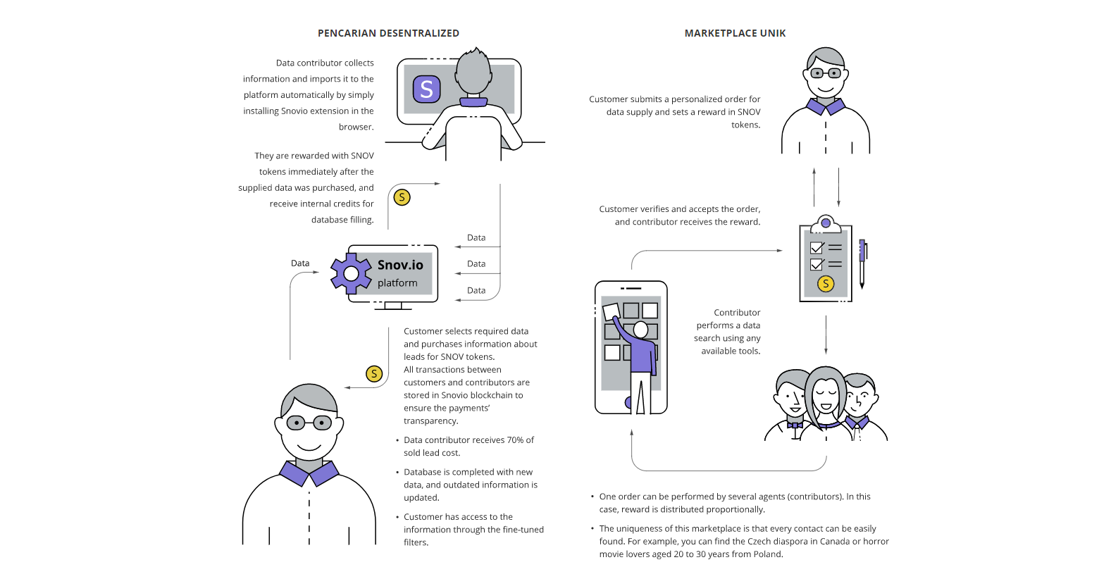 Simply put, first, customers interested in a particular type of prospect order an order in the database. Then, once the order is completed, the criteria are described in the smart contract. After that, the agent, who is interested in receiving the token will do a search. They can use their own tools or Snovio to search on social networks, catalogs, etc. Customers can then validate how well searches by partial but incomplete data look. Once the data provided by one or more agents is selected, the prizes awarded in the smart contract are distributed. Data remains in the system for further use.The token distribution runs like 70/30. 70% of sales revenue is distributed among contributors (data miners), while 30% follow the platform for sustainable network maintenance purposes
