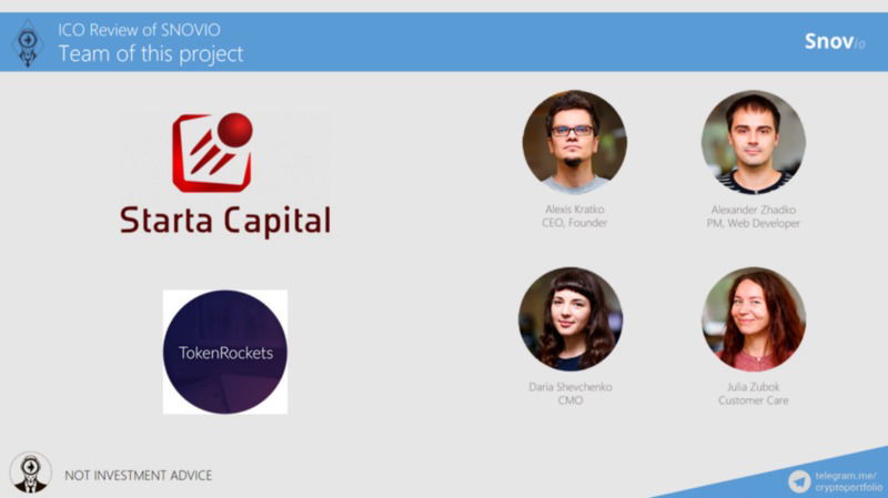 SNOV.IO is a Ukrainian based startup team, about 13 people, excluding advisers from around the world. These are the main managing staff. CEO Alexis Kratko, who has brought the platform from the idea development stage to 100 paying customers and financial sustainability in just 5 months. Next was CTO, Rodion Yaremenko, who created the high-level Snovio apron architecture and managed to build a secure system. Co-ordinated marketing experts Daria and Julia discuss the issue of users working with Snovio every day. Such advisors include Alexander Borodich, who was a pioneer in innovation and the world of blockchain and founder of Universa Blockchain; Renato Almeida, former project legal adviser for Minex.io and Trueflip.io; Alexey Girin, founder of Starta Capital funds; Kairat Kaliyev, founder of Cross Coin, who successfully performed Starta's ICO and attracted $ 5 million and others. Also, Starta Accelerator listed as ESCROW and Token Rockets are listed as technology partners.