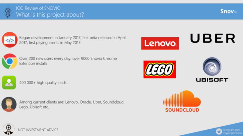 Snov.io began to be developed in January 2017. The first Beta version was released in April, and the first paying client subscribed on May 17, 2017. In a month snovio has 10 clients who pay from over 500 free users.There are about 200 new users every day and there are over 9000 SNOVIO Chrome extension setup.Currently, the lead contact database consists of over 400,000 unique contacts. With the help of decentralized data collection, the database is planned to grow several hundred times and make the service more attractive and accessible to different types of businesses.Among service users are companies such as: Lenovo, Oracle, Uber, Soundcloud, Lego, Ubisoft and so on. ..