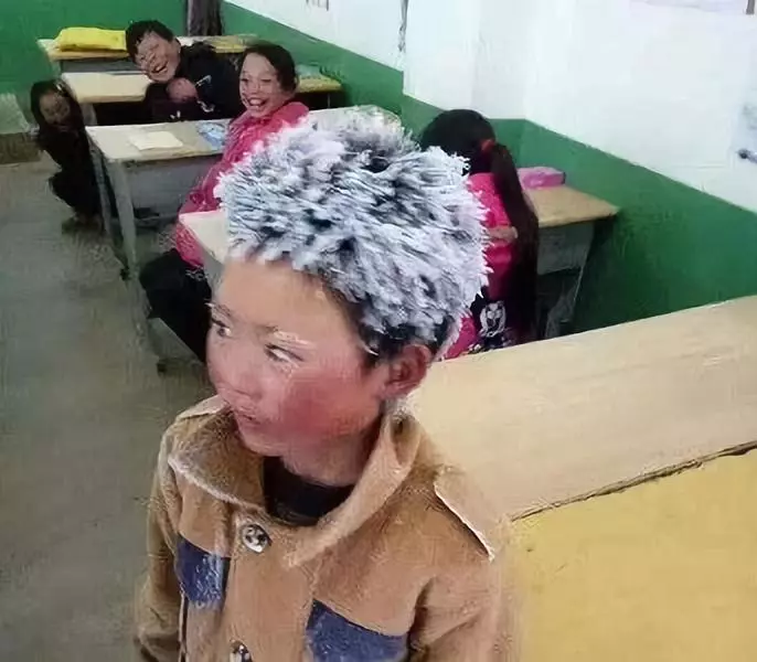 一年之前的2018年1月9日,云南昭通一名头顶风霜上学的孩子照片在网上引起广泛关注。照片中的孩子站在教室里,头发和眉毛已经被风霜粘成雪白,脸蛋通红,穿着并不厚实的衣服,身后的同学看着他的“冰花”造型大笑。有网友表示,看着好心疼。
