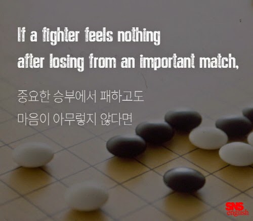 [번역] 바둑명인 이창호 9단의 생각snsenglish (25)in #snsenglish • 8 years ago "중요한 승부에서 패하고도 마음이 아무렇지 않다면 그 사람은 이미 프로가 아니다. 그것은 인품과 무관하다. 승부사에게 패배의 아픔은 항상 생생한 날 것이어야 한다. 늘 승자가 될 수는 없지만 패자의 역할에 길들여져서는 안된다." - 이창호 9단 ▒ 제작 : SNSenglish ▒ 무단 복제 및 배포를 금합니다. #english #learning #education #go