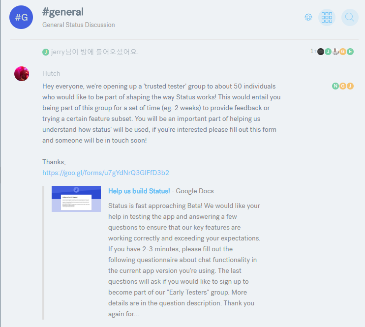 여러분, 저희는 '신뢰할 수 있는 테스터'그룹을 '상태'를 형성하는 데 참여하고자 하는 약 50명의 개인들에게 공개할 예정입니다! 이를 위해서는 일정 시간 동안 이 그룹에 참여해야 합니다(예: 2주)피드백을 제공하거나 특정 기능 하위 집합을 시도합니다. 귀하가 현황을 파악하는 데 중요한 역할을 할 것입니다. 관심이 있으시면 이 양식을 작성해 주시면 곧 연락 드리겠습니다!