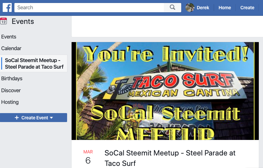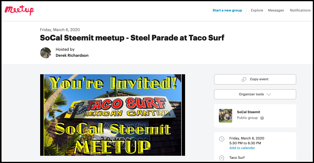 I was talking with Joe (aka @steemseph aka tetrahedroseph aka Jesus on the bass), who is one of the most dedicated and long standing members of SoCal Steemit, and we decided it had been too long since our last meetup! Joe is the bass player for the steel drum band @steelparade and every first friday of the month they put on a show at the Taco Surf Mexican cantina in Surfside, CA. We had a meetup there back in 2018 and it was so much fun. So as soon as Joe made the offer to host another meetup there, we picked the date and started promoting it! We made posts on Steem inviting people, we spread the word with our tweets on Twitter, I created an event in our Facebook group, and an event on meetup.com!