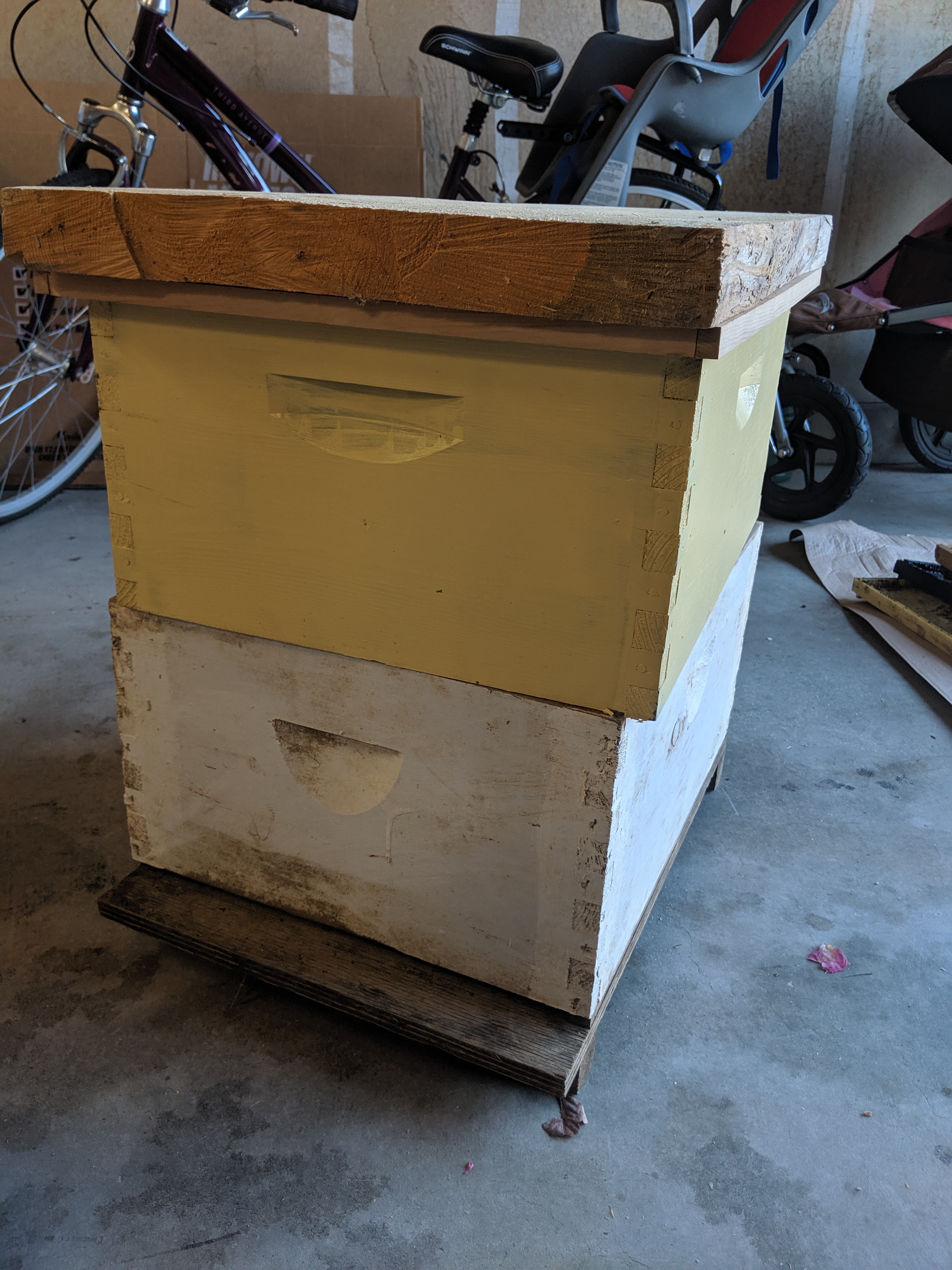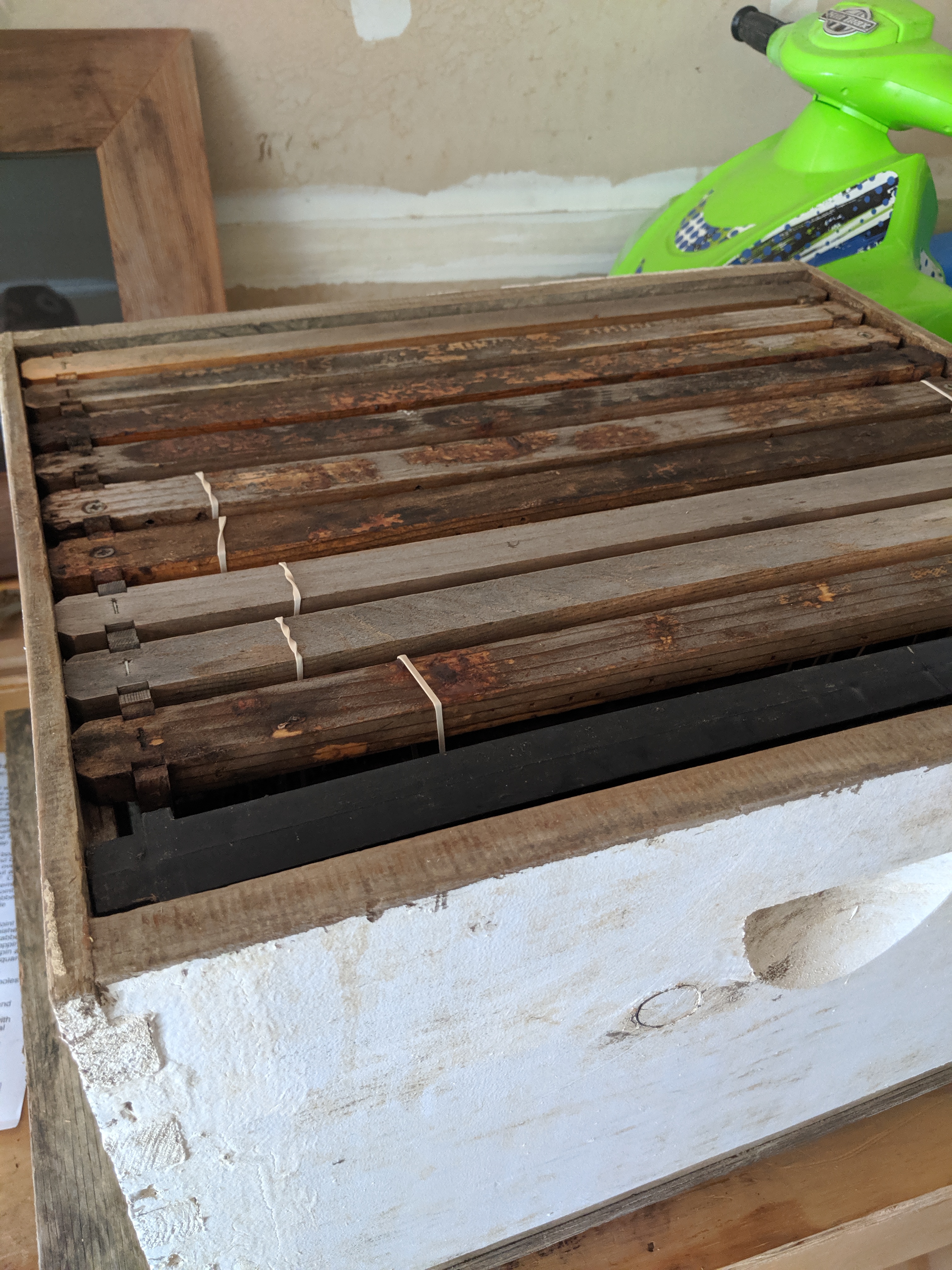 A few weeks ago I trimmed and cleaned up the old hives my parents gave me. They were a bit dirty and needed a good scrubbing. I planed the wood to get a good seal on the lid and gathered up all the wood frames for my deep hive body.