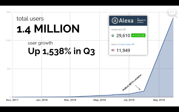 As it is in beta phase Webtalk will be paying its first 1 million users up to 50% revenues for LIFE. This means ANY of your followers that you directly invite to join Webtalk that make any purchase from Webtalk you will receive 10% commission up to 5 levels deep! Not only that but you will also receive payment on the amount of followers you bring in. As of November 4th, 2018 we are currently at over 1.4 million users.... thats 1,538% growth in Q3.