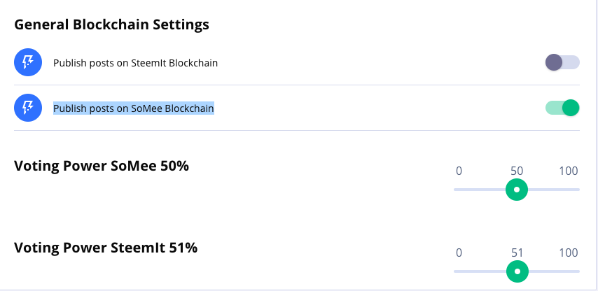 Finally, once you're at the blockchain settings submenu, make sure that the slider next to "publish posts on Somee blockchain" is green, as seen below. If you'd like to also post to Steemit, you can select that as well.