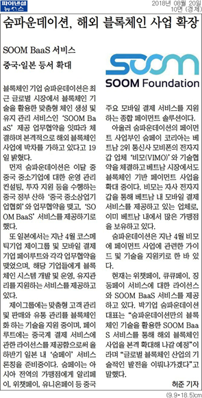 SOOM TECH. concluded several contracts for providing BaaS(Blockchain as a Services), and it was highlighted by major Korean press. Below article was posted on Economy section of Financial News on August 20, 2018. Unfortunately, article is available only in Korean.