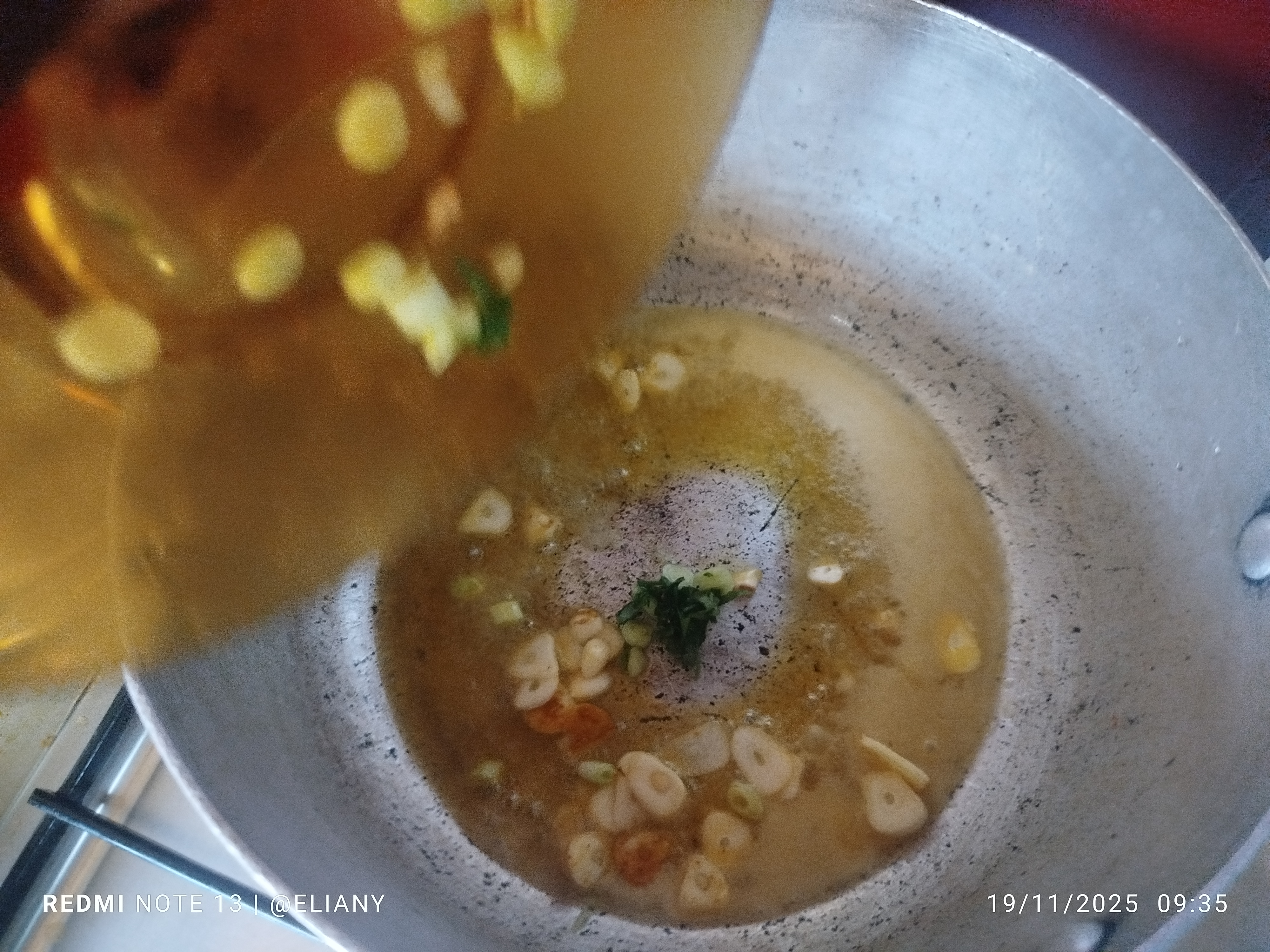I heated pan on fire, added butter to the pan and it melted. I poured the chopped garlic and scent leaf and fry some seconds.