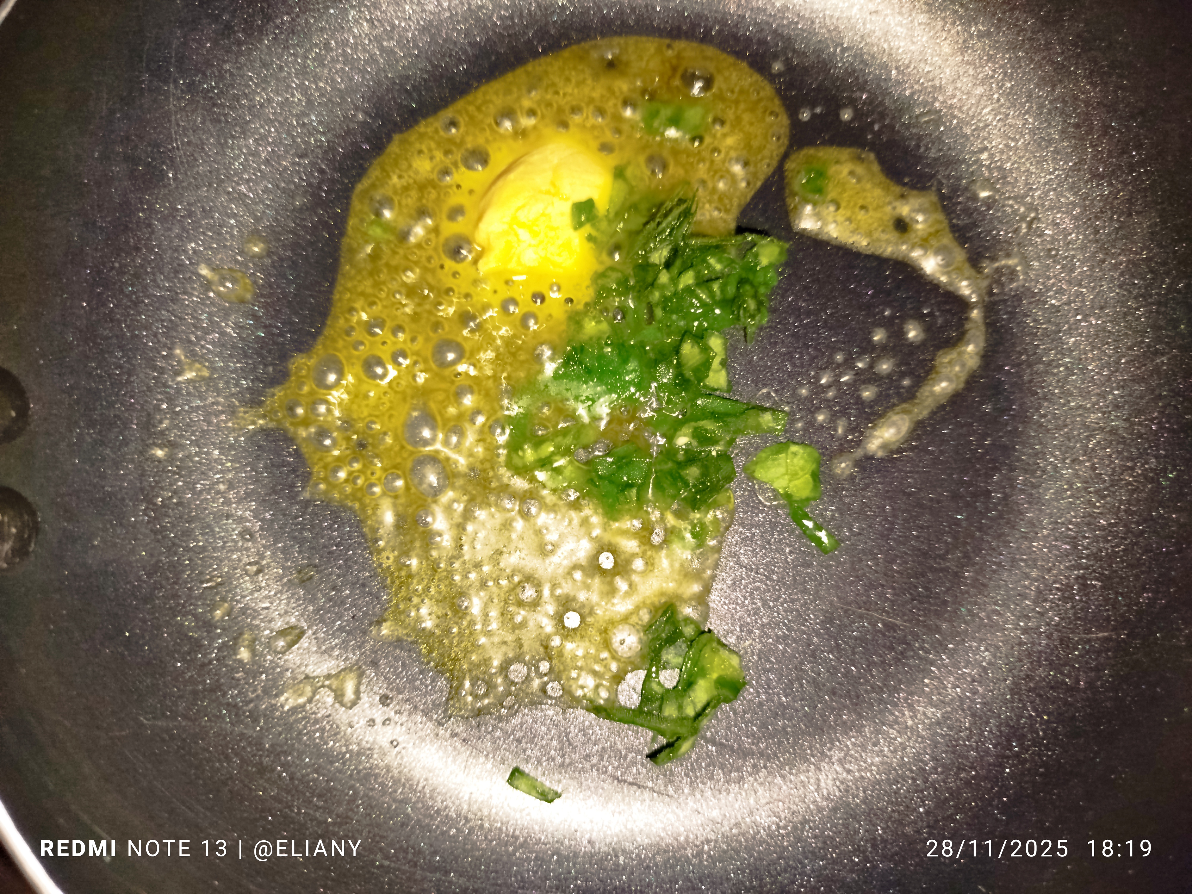Add butter to pot, allow it to melt then add leaf and garlic paste and fry for some minutes.