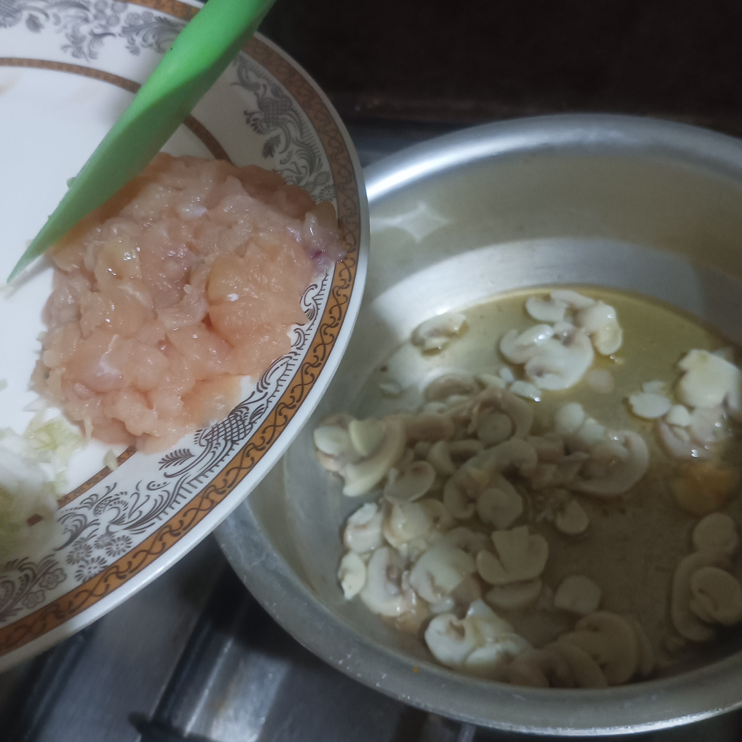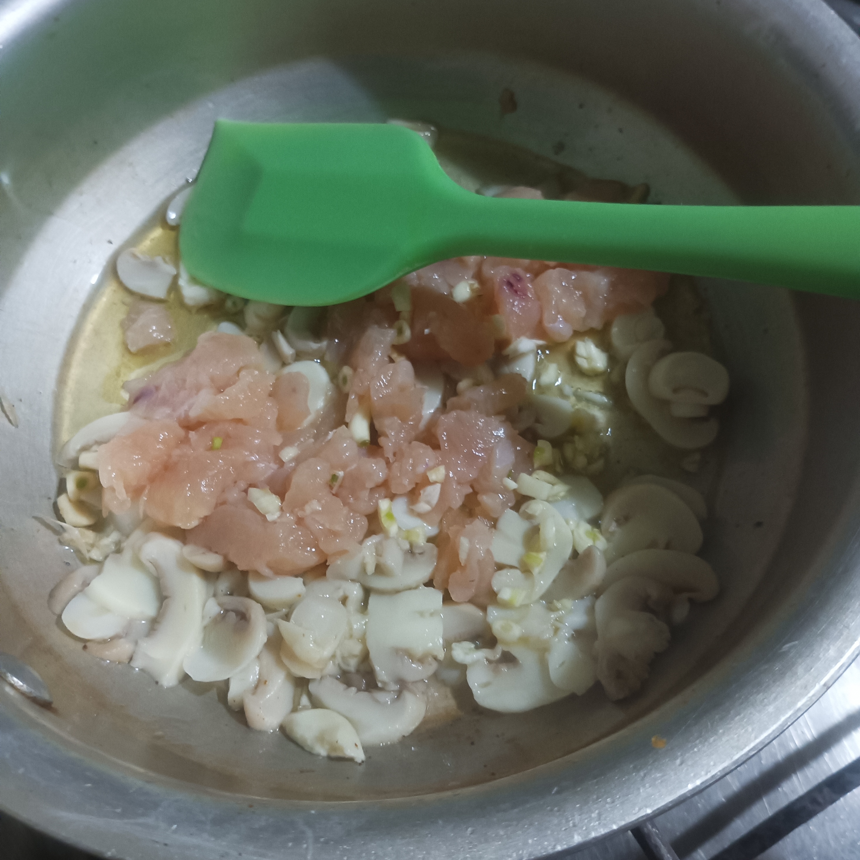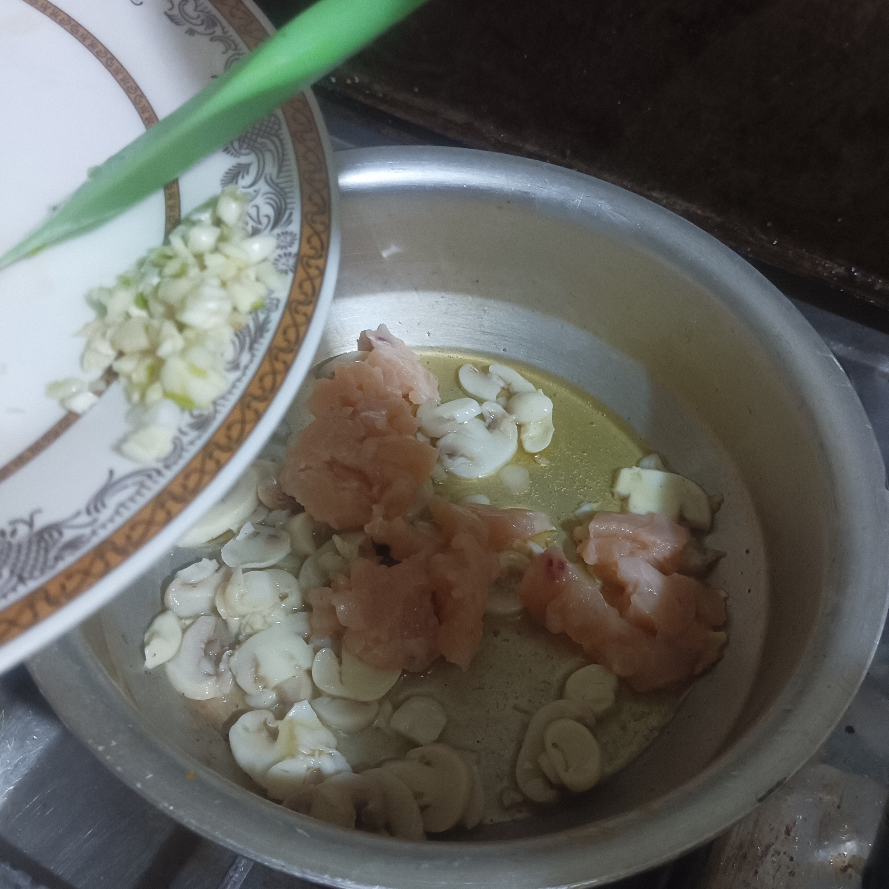 Let's going to start make the process of Mushroom Soup for the last week. For this we will take cooking pot added in ² tsp butter or olive oil let it heat up then we will put in slices or chopped Mashrooms, chopped chicken , salt and garlic. We will saute it for 10 minutes until turns into golden color and until fragment.