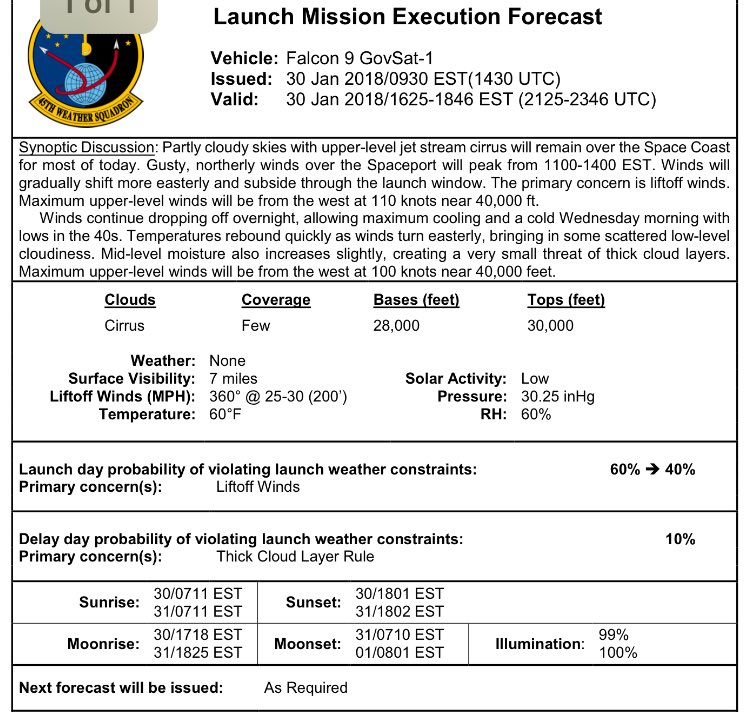 Updated launch weather forecast. 40% favourable conditions at the opening of the window, increasing to 60% go conditions as the window progresses. #SpaceX #Falcon9 #SES16 #GovSat1 #Luxembourg pic.twitter.com/j4NqdmhS5G