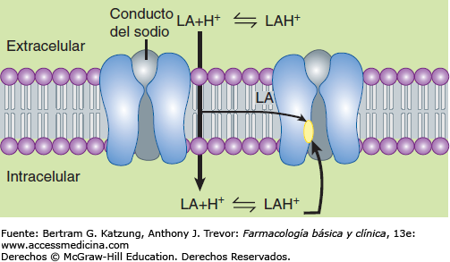 La célula tiene un potencial electronegativo, los canales de Sodio (Na+) son voltajedependientes y estos van monitoreando la electronegatividad de la célula, cuando empieza a entrar Sodio (Na+), este va entrando lentamente y se va haciendo menos negativo el potencial, hasta que llega al umbral donde hay una activación masiva de todos los canales de Na entrando 7000 iones Na/segundo a la célula convirtiendo el potencial en positivo. Si un fármaco bloquea los canales de Na no se podrá producir el potencial de acción; tanto a nivel presináptico, impidiendo la liberación de neurotransmisores, como a nivel postsináptico deteniendo la transmisión de impulsos.