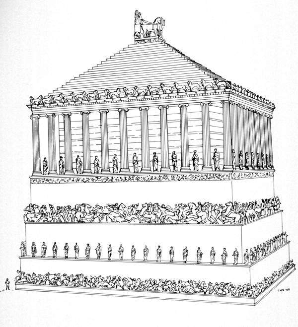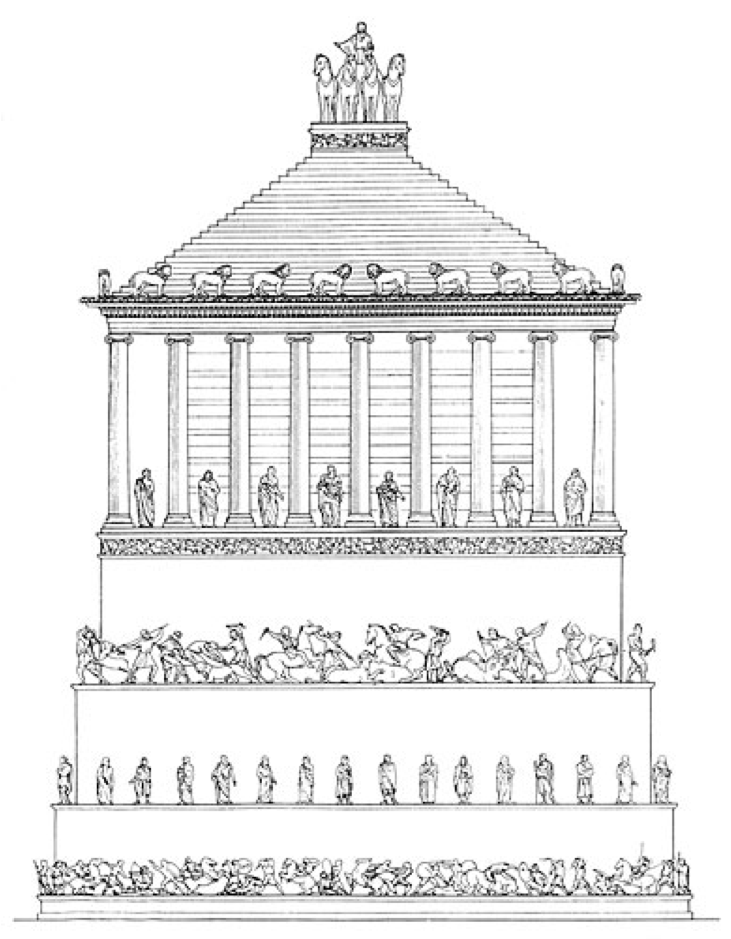 Mausoleo de Halicarnaso: es una tumba monumental, que fue aceptada como una de las siete maravillas del mundo y se hizo usando la arquitectura griega y la arquitectura egipcia. Los coloniales reflejan la inspiración de la arquitectura griega, el techo de la pirámide y las características de la arquitectura egipcia. Monumento MÖ. Fue construido por su esposa y hermana en el presente Bodrum, Halicarnaso, para el Mausoleo, el rey de Caria que murió en 353. La tumba monumental y las estructuras similares, que están diseñadas con un tamaño grande, se llaman mausoleo.