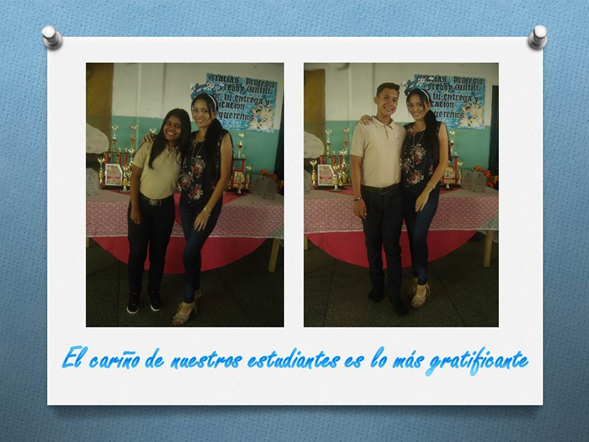 Ahora puedo decir, que lo más gratificante que me ha ido dejando mi carrera docente es esa interrelación y el cariño que muestran mis estudiantes hacia mí, Escucharlos decir, “Profe. Te Quiero” “Prof. La extraño” es realmente motivador.