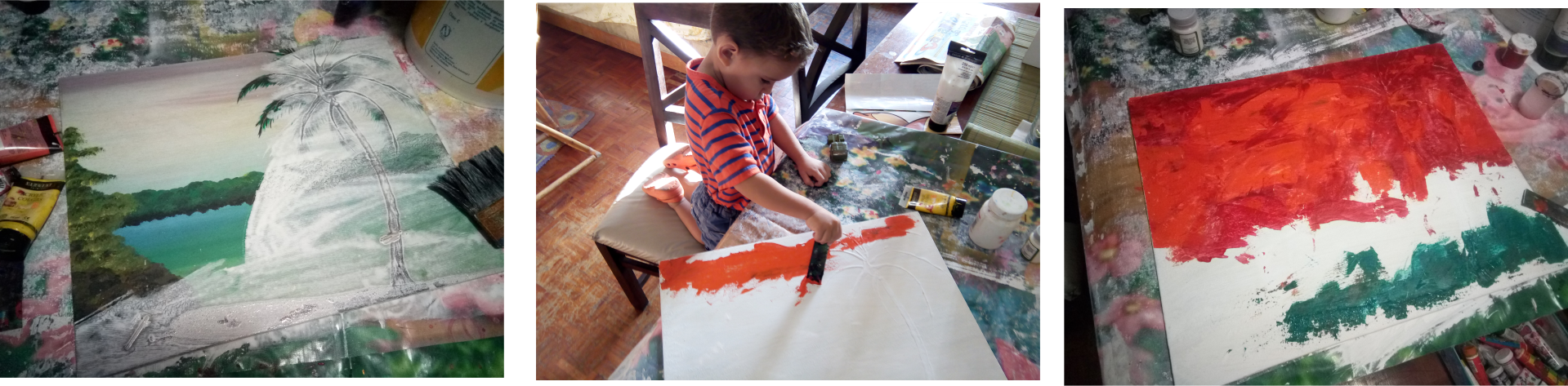 - Seguidamente con ayuda de mi asistente favorito empecé a aplicar colores acrílicos a base de agua para empezar a darle forma al nuevo paisaje.