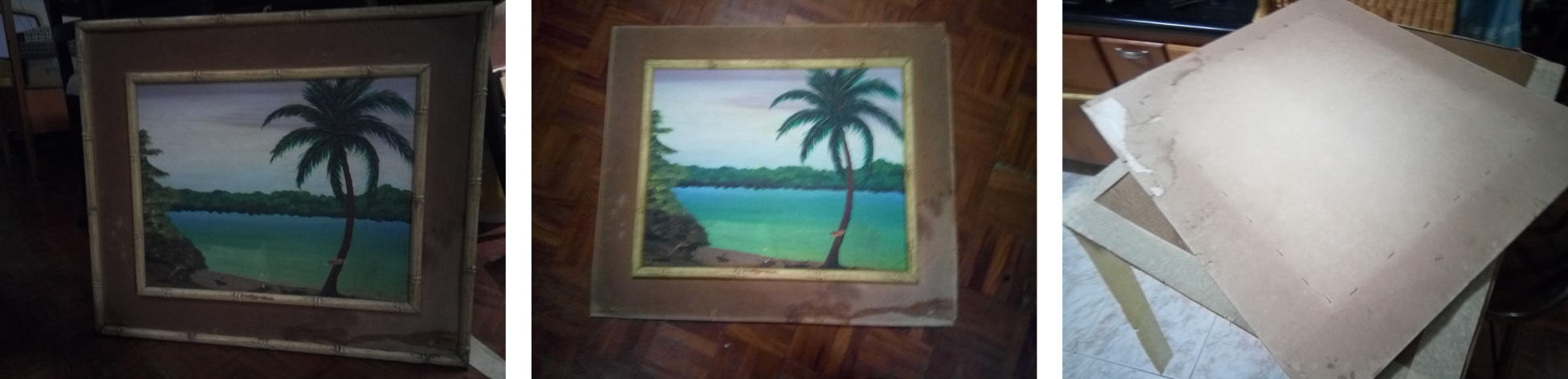 Por allá por el mes de diciembre de año pasado 2017 mi madre estaba haciendo limpieza en su casa, y estaba desechando algunas cosas que según ella eran inservibles, dentro de esas cosas inservibles estaba el cuadro, realmente deteriorado y se veía bastante mal. Sin embargo ella no lo desechó y lo apartó para dármelo a mí, sus palabras textuales fueron éstas cuando me lo dio: “toma hijo, seguro tú le sacas provecho a esto y usas ese material”, yo lo recibí y lo guarde.