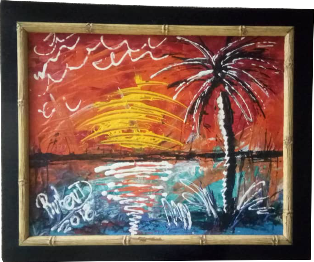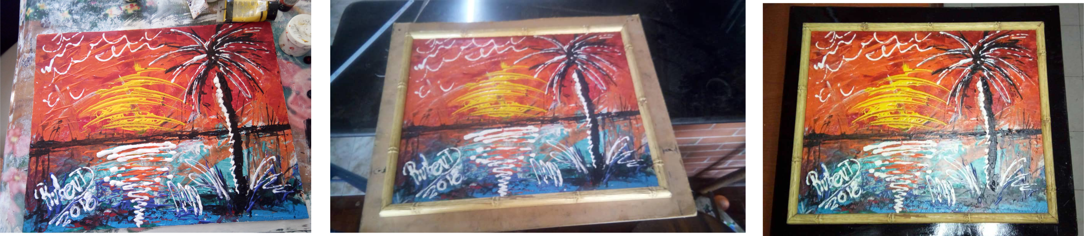 Aproximadamente como diez días antes de salir del país rumbo a México (donde me encuentro actualmente por circunstancias y decisiones tomadas), desmantelé el cuadro y me dispuse a hacerlo nuevamente, lo primero que pensé fue mantener la idea de la playa y el paisaje, pero con mi estilo particular de pintar y hacer mis obras.