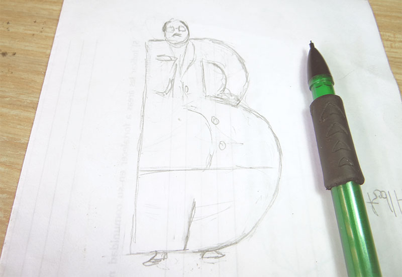 Era el segundo día del reto, y ya con mi idea clara y un par de fotografías del señor barriga empecé a bocetar. Pienso que como anteriormente ya venía madurando la idea por mucho tiempo en mi mente, fue el motivo por el que no tardé demasiado para materializarla en papel, ya desde antes había pensado en usar uno de sus brazos para la parte superior de la letra y el otro estirado hacia adelante como si estuviese cobrando la renta —pues no quería que ese brazo alterara la silueta—, he de decir que yo mismo me sorprendí de lo rápido que había salido, y aun cuando estaba feliz con el resultado quise probar suerte con otro boceto un poco más dinámico, pero al final terminé decidiéndome por el primero.