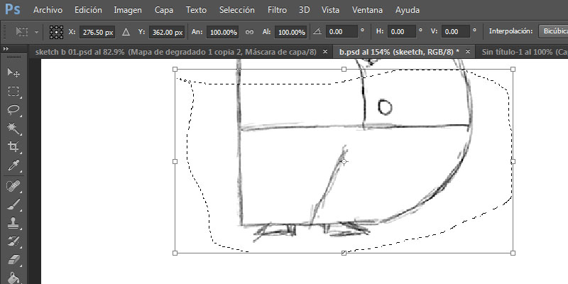 Ya que aún estaba tan feliz con mi boceto no quise hacer otro sino que en su lugar usé la herramienta del lazo de selección y la opción de transformación libre (Crtl+t) para deformarlo, tarea que me tomó un montón de tiempo, empecé modificando de poquito pero llegó el momento en que vi la necesidad de ser más brusco, hasta que por fin conseguí un Sr. Barriga bien rechoncho. A este punto aunque feliz por cómo estaba quedando ya me sentía algo agotado por tantas horas dedicadas a una sola cosa, pero el tiempo seguía corriendo y tenía que acabarlo antes de que se terminara el día.