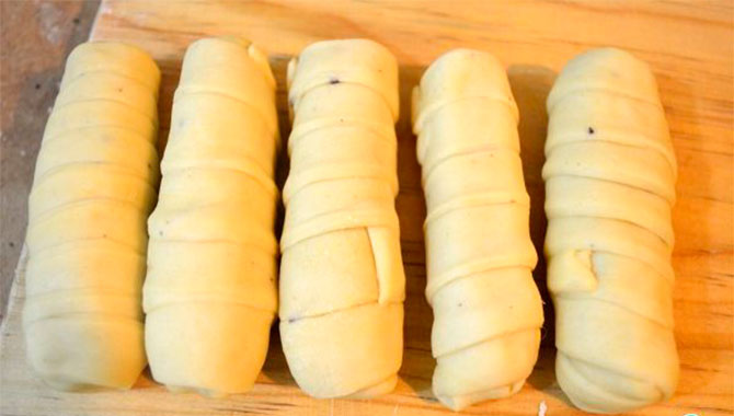 Agarramos un palito de queso y con una tira de masa se la vamos enrollando, tratando siempre de que el queso quede bien envuelto, sin dejar espacios en la masa para que al freírlo no se escape nada.