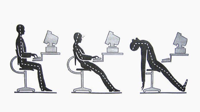 With legs at right angles and arms resting on the table or on the armrests of armchair or chair. The two feet must be in contact with the ground. The seat should not be longer than 2/3 of the length of the thigh, without ever being in contact with the posterior region of the knee. The back should be in contact with the back, especially the lower back. The angle of inclination of the backrest will depend on the activity carried out being more reclining 110º when it is to rest and around 105º when it is to read.