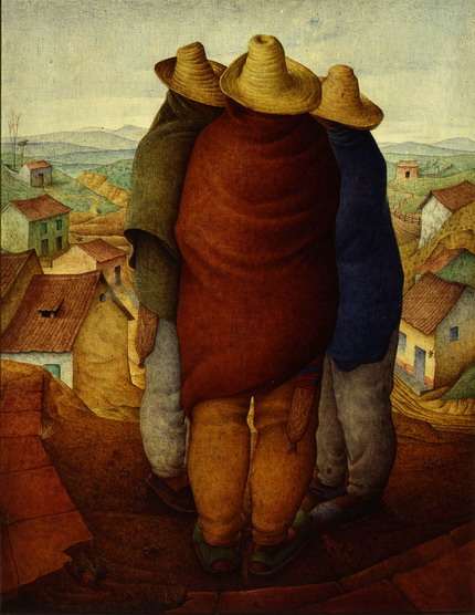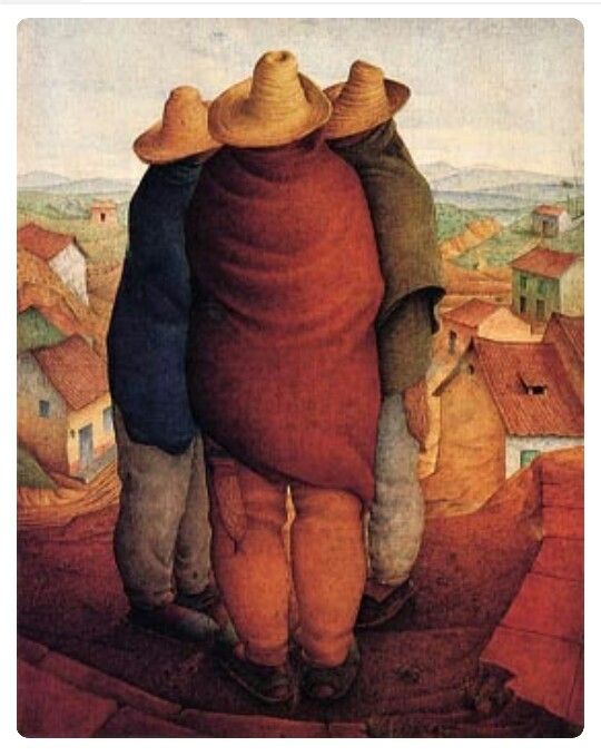 De no ser por el título de la obra, podríamos prensar en tres agricultores andinos dirigiéndose a sus labores, pero, al saberlos "comisarios" en la época de la dictadura de Juan Vicente Gómez, entonces las fundas que cuelgan de sus cinturas no guardan una herramienta de trabajo sino un arma de opresión. Seguramente los tres eran compadres de presidente... las rústicas sandalias calzadas en unos pies muy grandes expuestos al frío, mientras el resto de sus cuerpos está oculto, nos cuentan de la violencia que están dispuestos a ejercer, pero también nos revelan una ignorancia asumida como forma de vida, un odio al conocimiento y a la libertad que él nos otorga.