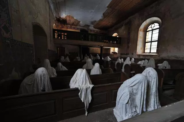 Diez años después, la Capilla de San Jorge, en la pequeña aldea de Luková, seguía cayéndose a pedazos (¿creíais que nunca iba a volver a lo de los fantasmas?), abandonada en 1968, carcomida por el desgaste y desvalijada por ladrones y desaprensivos. El pueblo había intentado reconstruir por lo menos el techo, pero la recaudación fue insuficiente. El Departamento de Diseño y Bellas Artes de la Universidad de Bohemia Occidental quiso cambiar esto por completo, así que asignó el encargo a un joven estudiante de nombre Jakuv Hadrava, que lo convirtió en su proyecto de tesis. Hadrava, consciente de la terrible historia que rodeaba a la región, fabricó nueve figuras de yeso cubiertas por telas blancas, a modo de fantasmas, y las distribuyó por la ruinosa capilla. Lejos de reconstruir San Jorge, lo que hizo Hadrava fue dotarla de un nuevo significado. En sus propias palabras, lo que buscaba era «representar las almas de los alemanes que fueron expulsados de aquí después de la Segunda Guerra Mundial», y que ahora por fin podían volver a casa, a su capilla, a las misas a las que asistían cada domingo. Era un medio para que nadie se olvidara de lo crueles que pueden llegar a ser los gobiernos, y lo vulnerables que se encuentran las personas ante ello.
