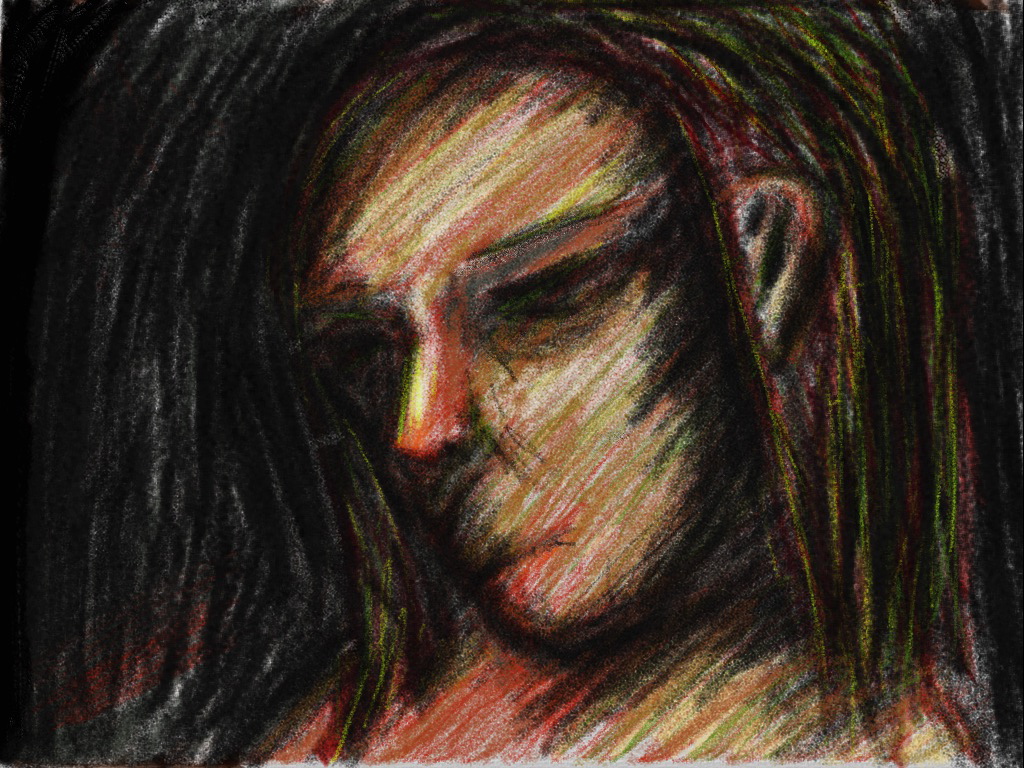 cuando empece a dibujarlo, en lo único que pensaba era en agachar la cabeza, creando una mirada perdida hacia el suelo, cosa que significaba que todo se había caído y no sabía donde empezar a levantar, obviamente más adelante me levante y seguí con mi vida.