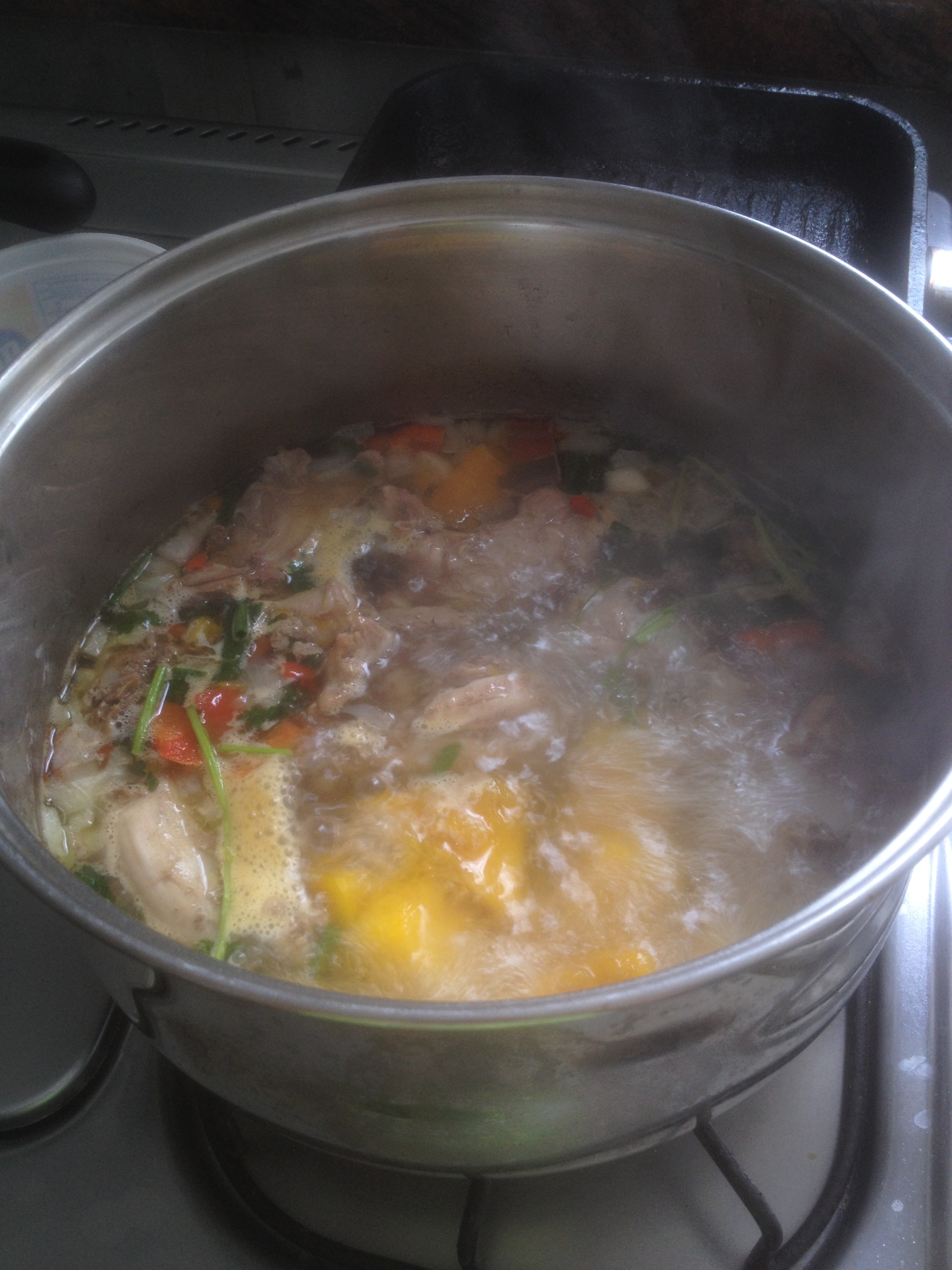 - Minutos después, cuando el pollo este sancochado, agregamos la auyama y los aliños.
