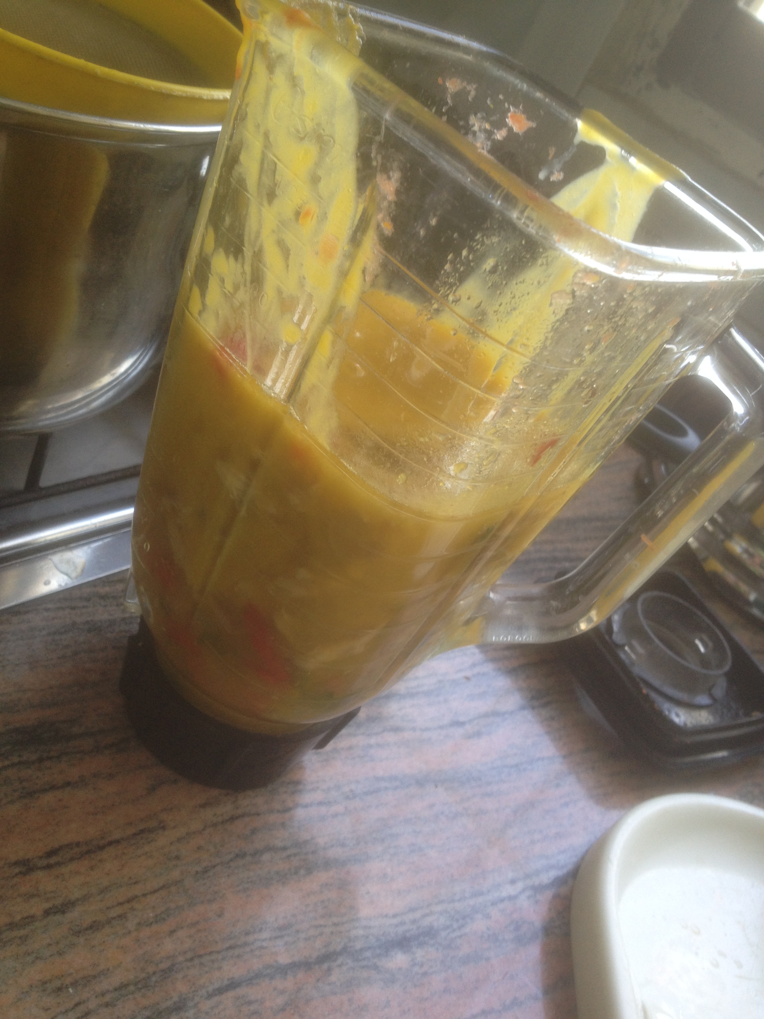 - Una vez reposada, en la licuadora vamos a colocar la auyama, con el caldo, incluyendo los aliños (Todo en armonía y proporción para que pueda quedar cremosa, es decir no colocar tanta agua si no hay mucha auyama).