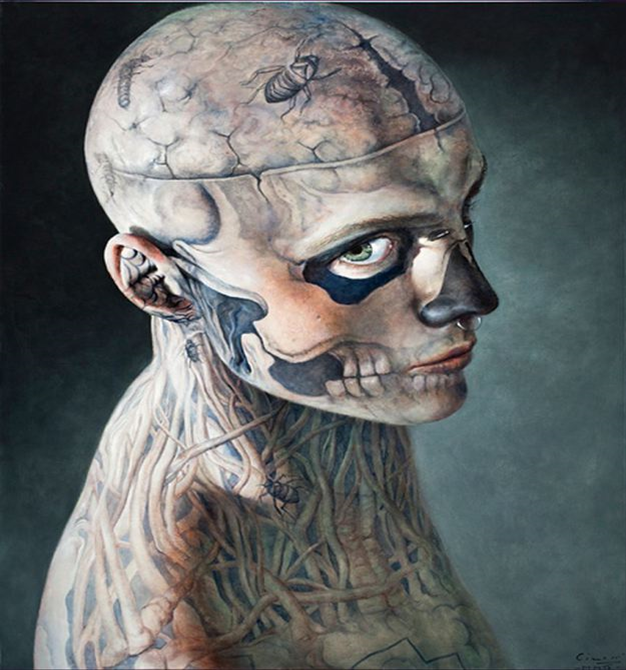 En esta pintura al óleo, nos quiere mostrar la transparencia que existe en el cuerpo de los seres humanos, donde sin movernos y expresarnos, podemos transmitir mucha cosas, donde todos sin importar raza o color somos iguales, por donde fluye la sangre, las venas, y arterias, donde el rostro refleja la variedad de rasgos de las personas, el mestizo, el mulato el blanco, el color verde de sus ojos refleja lo reservado y esplendoroso de las personas, en una mirada que te sigue a donde vas, los insectos en su cuerpo pueden expresar la evolución del alma y el cuerpo, de capullo a oruga; la mariposa se transforma en un ser alado que consigue la libertad absoluta, al igual que seremos alimento también de ellos, como decir que seremos sustentos para su desarrollo, los insectos tratan de ingresar al cerebro para poder apoderarse de la sabiduría del ser humano y poder igualarlo, ya que estos no poseen cerebro y no pueden pensar, como también el de tener corazón, los huesos representan la fortaleza del hombre, para luchar por sus ideales, todo lo que se tiene internamente es reflejando al exterior, dando a conocer los sentimientos, sus plisen demuestra como la hacían nuestras raíces, su virilidad y coraje ante la adversidad, la cabeza abierta pretende enseñar la sabiduría del hombre como también la diversidad de ellos. Sus venas y arterias son como cables, que pueden trasmitir energía y luz hacia los demás.