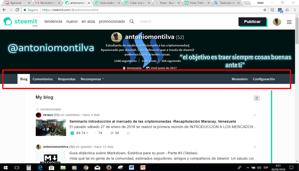 Una vez ubicados en nuestro perfil, podremos observar en el centro una barra que contiene distintos títulos para las distintas secciones anteriormente mencionadas. Hacia la izquierda se ubican: Blog; Comentarios; Respuestas; Recompensas. A la derecha se ubican: Monedero; Configuración.