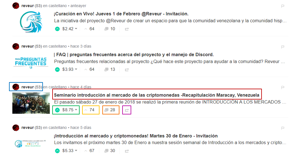También, en una publicación, al final y/o en la vista previa podremos ver el número de upvotes (los upvotes son los "me gusta" de steemit), la recompensa generada por el post, el número de comentarios, de visualizaciones, y el boton para hacer resteem (el resteem es la forma para "compartir" las publicaciones que nos han gustado de los demás usuarios). En la imagen de la derecha, te muestro la vista previa de como se observan las publicaciones en steemit (antes de abrirlas). En el recuadro azul se ubica el nombre de usuario quien publica el post, lo señalado en rojo es el título, en el recuadro verde está la recompensa generada, en amarillo el número de upvotes, en naranja el número de comentarios, y en purpura el botón para compartir la publicación (resteem).