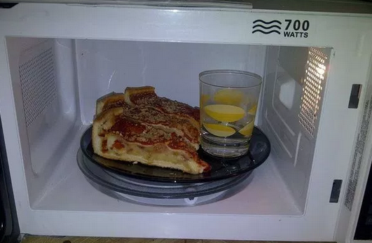 **>3 Para mantener la pizza crocante: un vaso de agua en el microondas mientras la recalientas