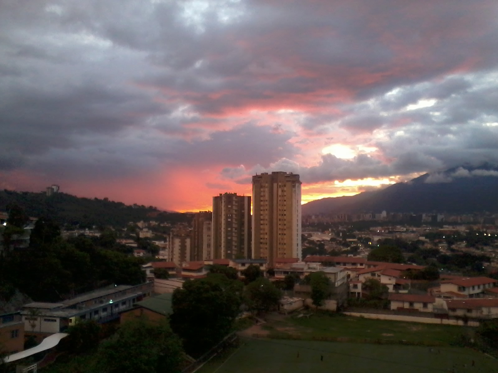 El atardecer es un poema de colores, al irse ocultando el Astro Rey para dar paso a la noche, las nubes reflejan sus tonos amarillos y anaranjados haciendo un hermoso contraste con la palidez y neutralidad propios de esos cuerpos efímeros que pasan silenciosamente por el Valle de Caracas, sus cerros y la montaña guardiana El Ávila.