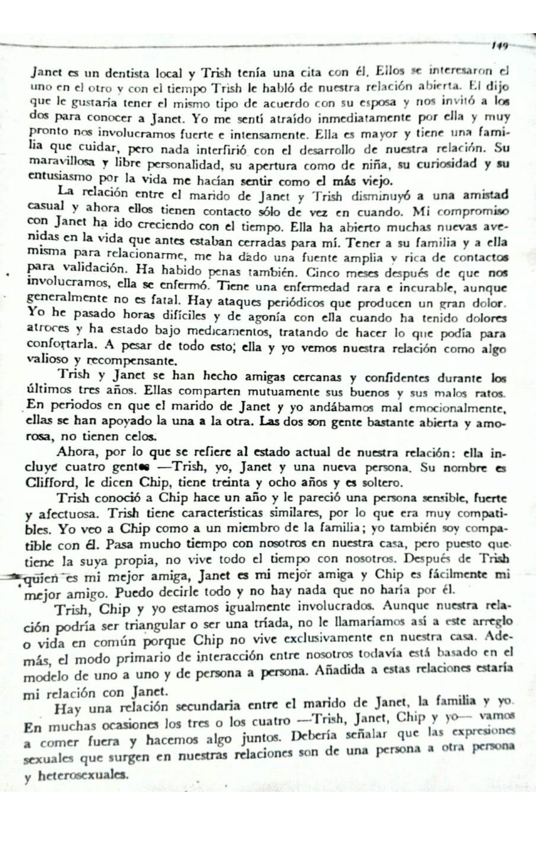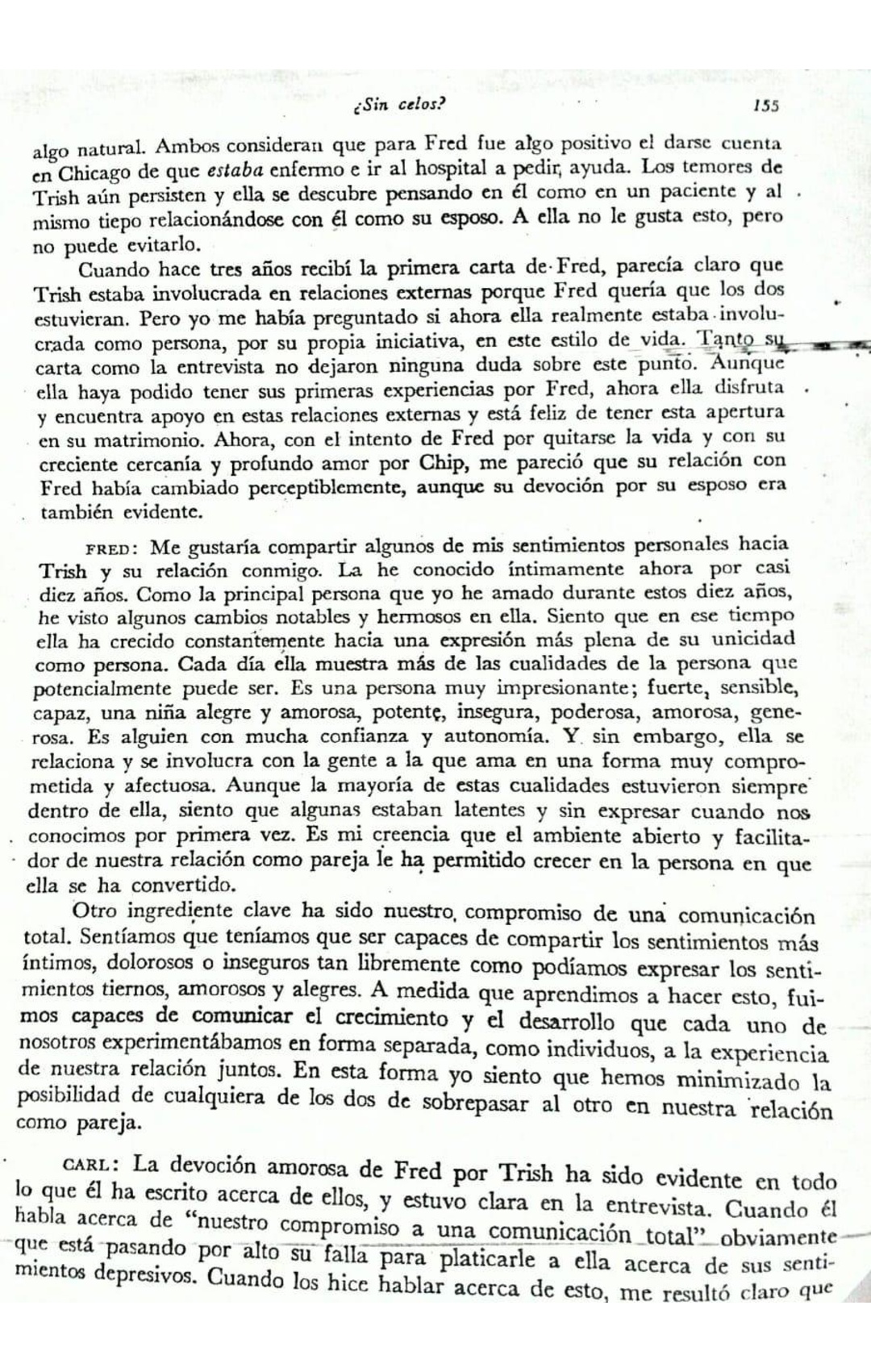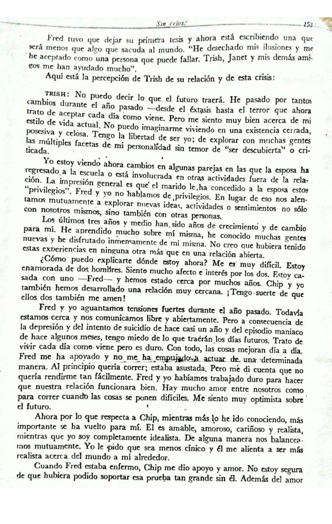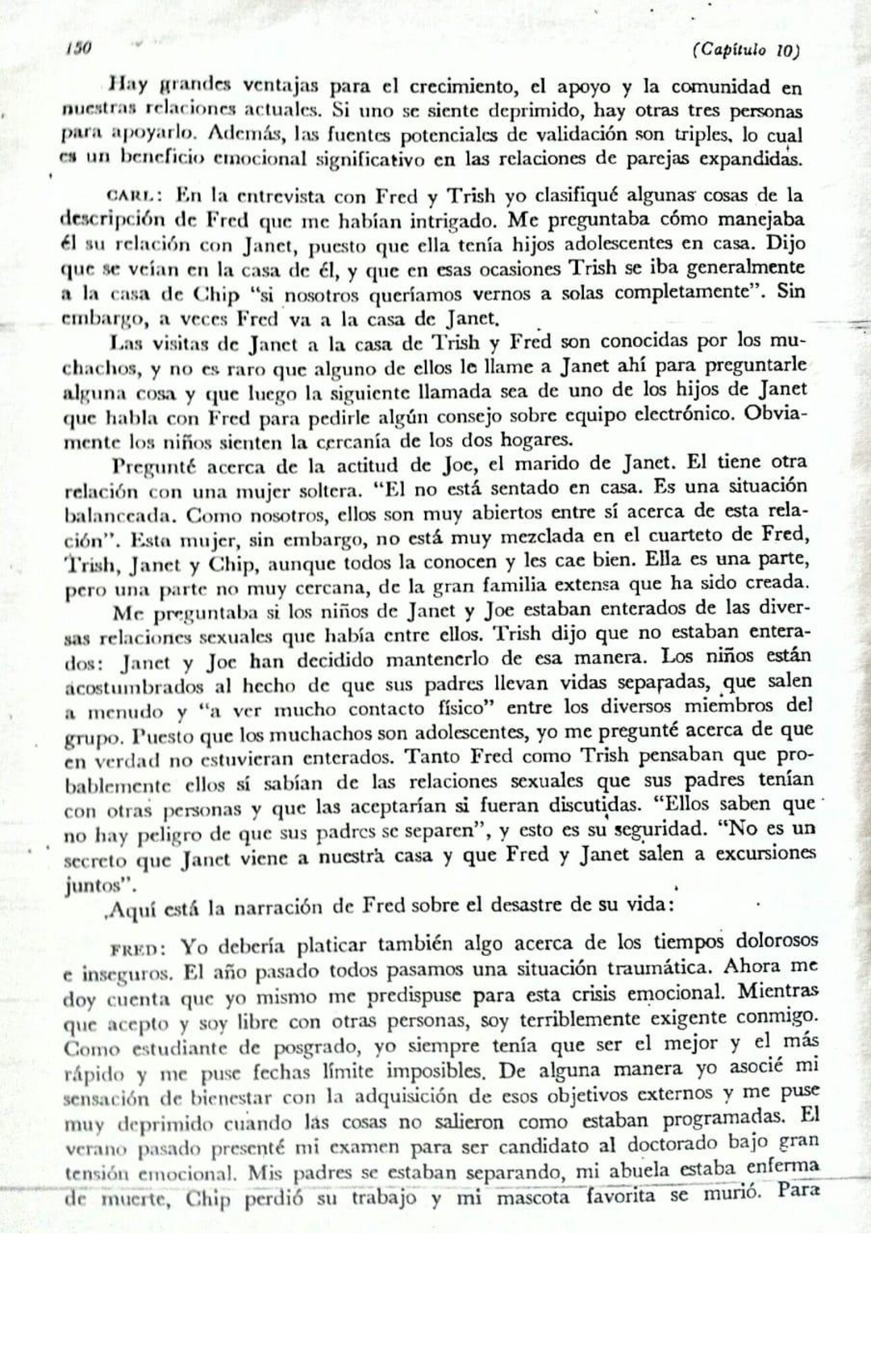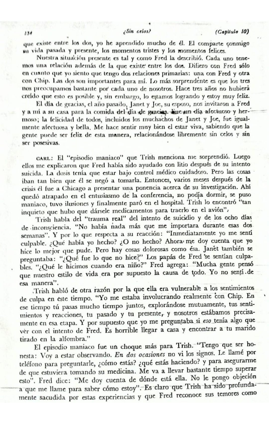 No veo como positiva la relación abierta de Fred y Trish, ya que la situación es bastante intrigante por las conducta suicida de Fred, aunque el diga “Yo debería platicar también algo acerca de los tiempos dolorosos e inseguros. El año pasado todos pasamos una situación traumática” página 150 donde el culpaba una calamidad que a afecto a los cuatro integrantes de la relación, claro está no veo esta muerte ni sus frustraciones con la tesis para llegar a un comportamiento suicida, lo que me hace pensar es que a Fred se le salió de las manos la relación porque su esposa Trish veía a Chip y a Fred como relaciones principales y los amaba por igual pero Fred veía a Trish como su amor principal y a Janet como a su amor segundario, la gran discusión es que Fred se empezó a sentir inseguro.