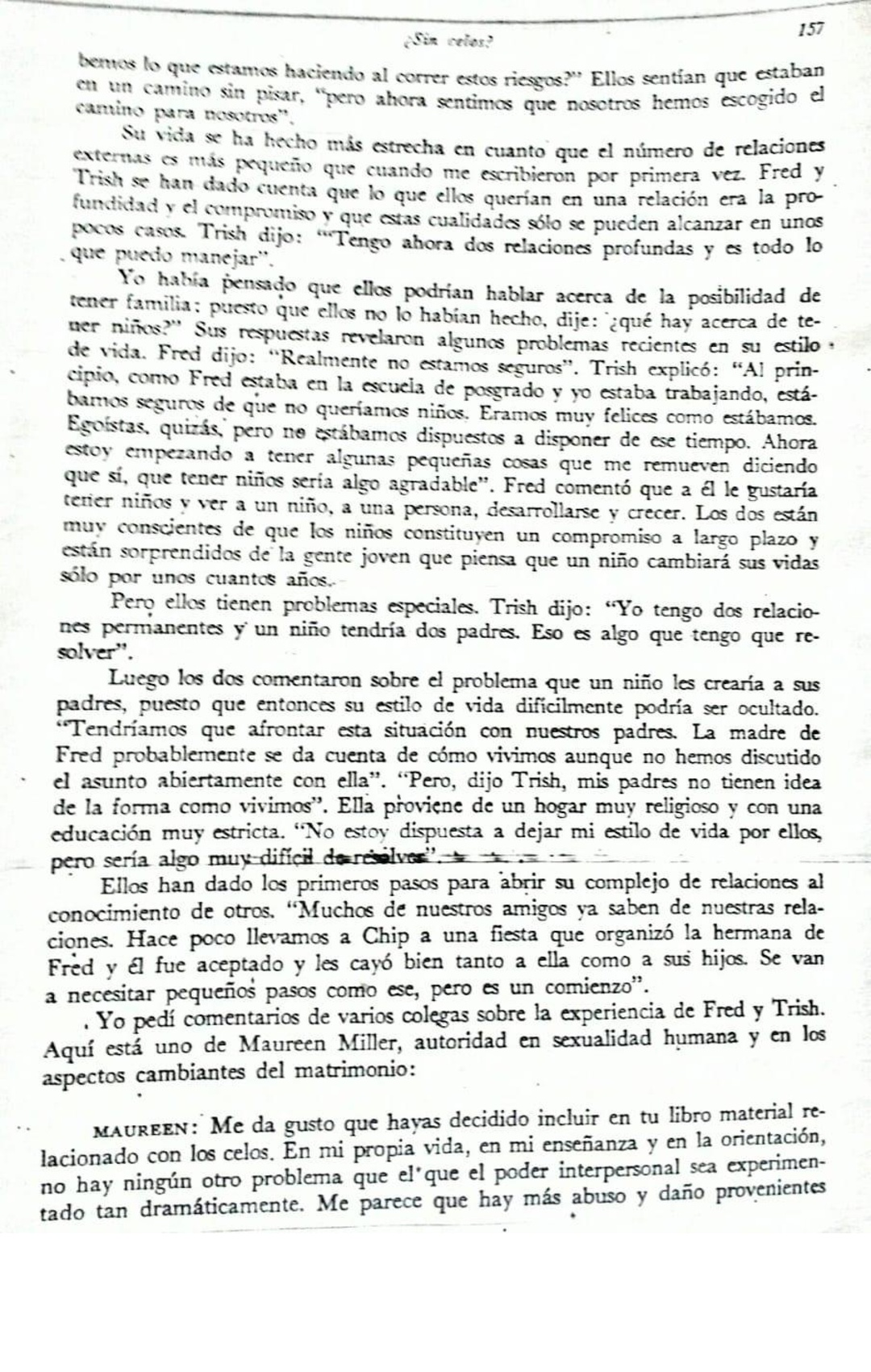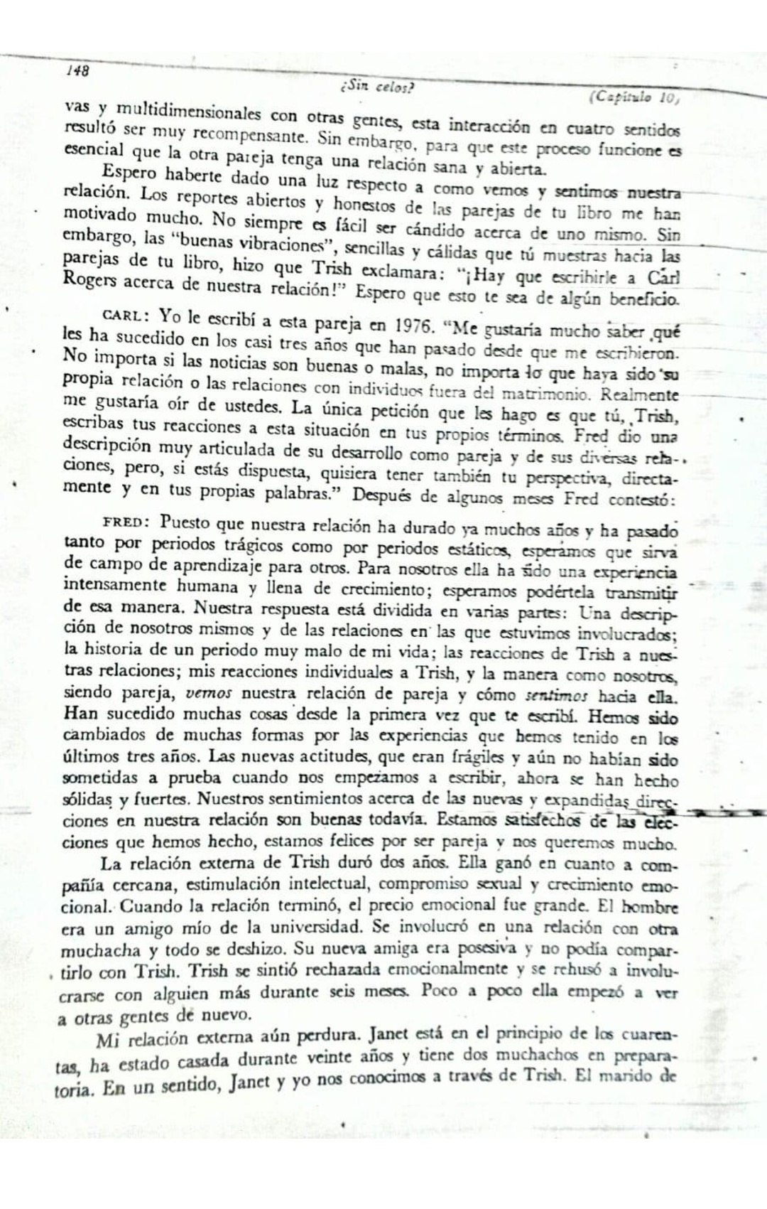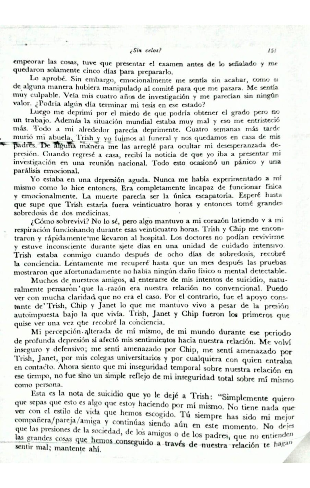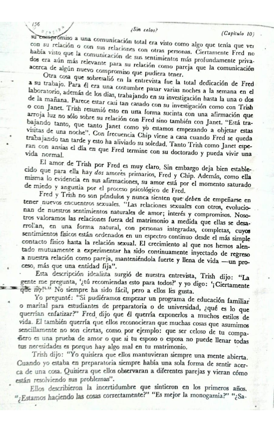 No veo como positiva la relación abierta de Fred y Trish, ya que la situación es bastante intrigante por las conducta suicida de Fred, aunque el diga “Yo debería platicar también algo acerca de los tiempos dolorosos e inseguros. El año pasado todos pasamos una situación traumática” página 150 donde el culpaba una calamidad que a afecto a los cuatro integrantes de la relación, claro está no veo esta muerte ni sus frustraciones con la tesis para llegar a un comportamiento suicida, lo que me hace pensar es que a Fred se le salió de las manos la relación porque su esposa Trish veía a Chip y a Fred como relaciones principales y los amaba por igual pero Fred veía a Trish como su amor principal y a Janet como a su amor segundario, la gran discusión es que Fred se empezó a sentir inseguro.