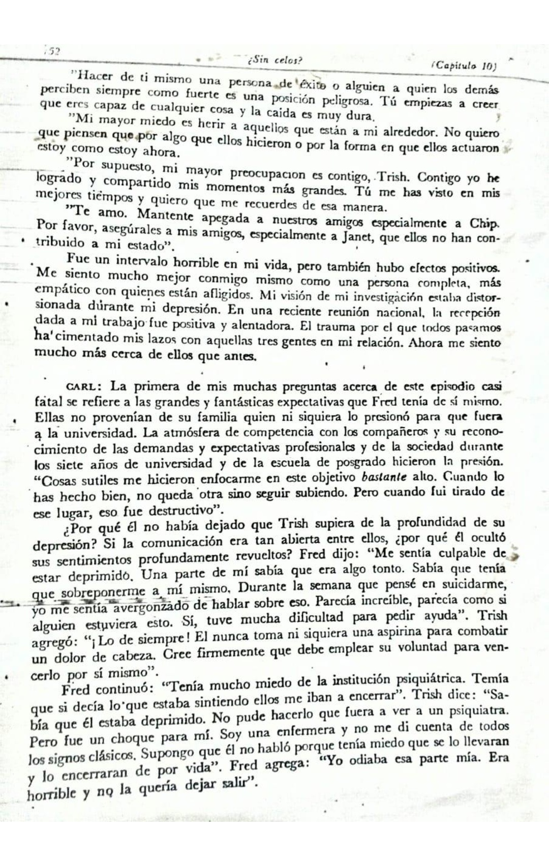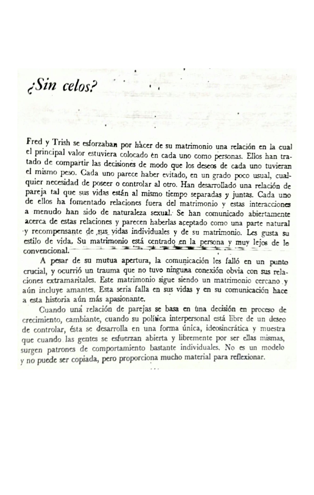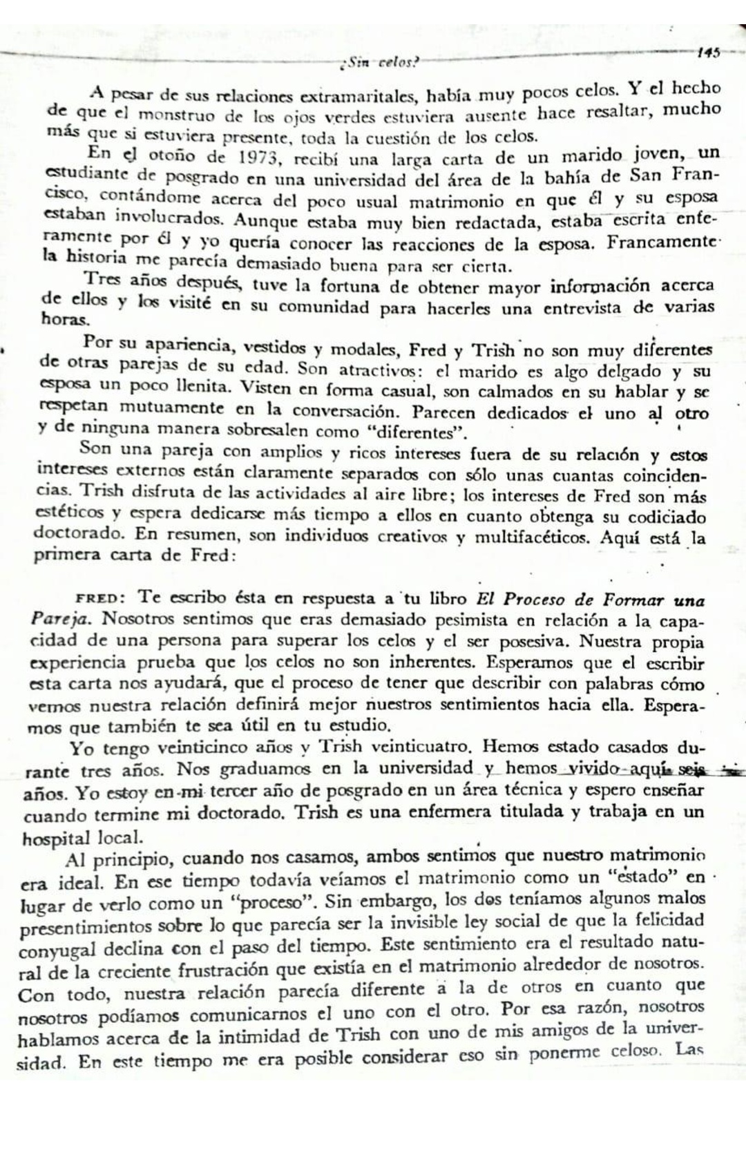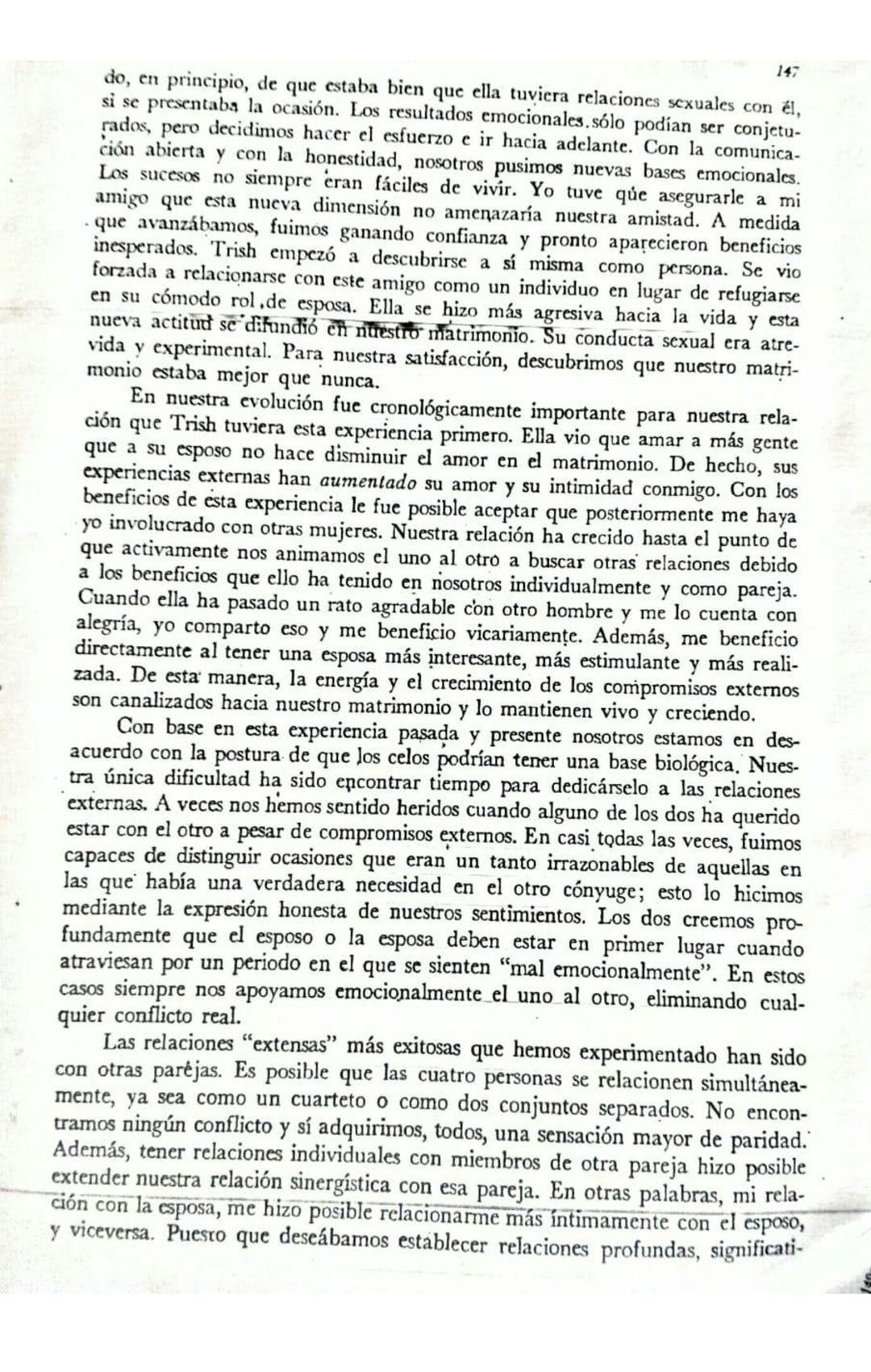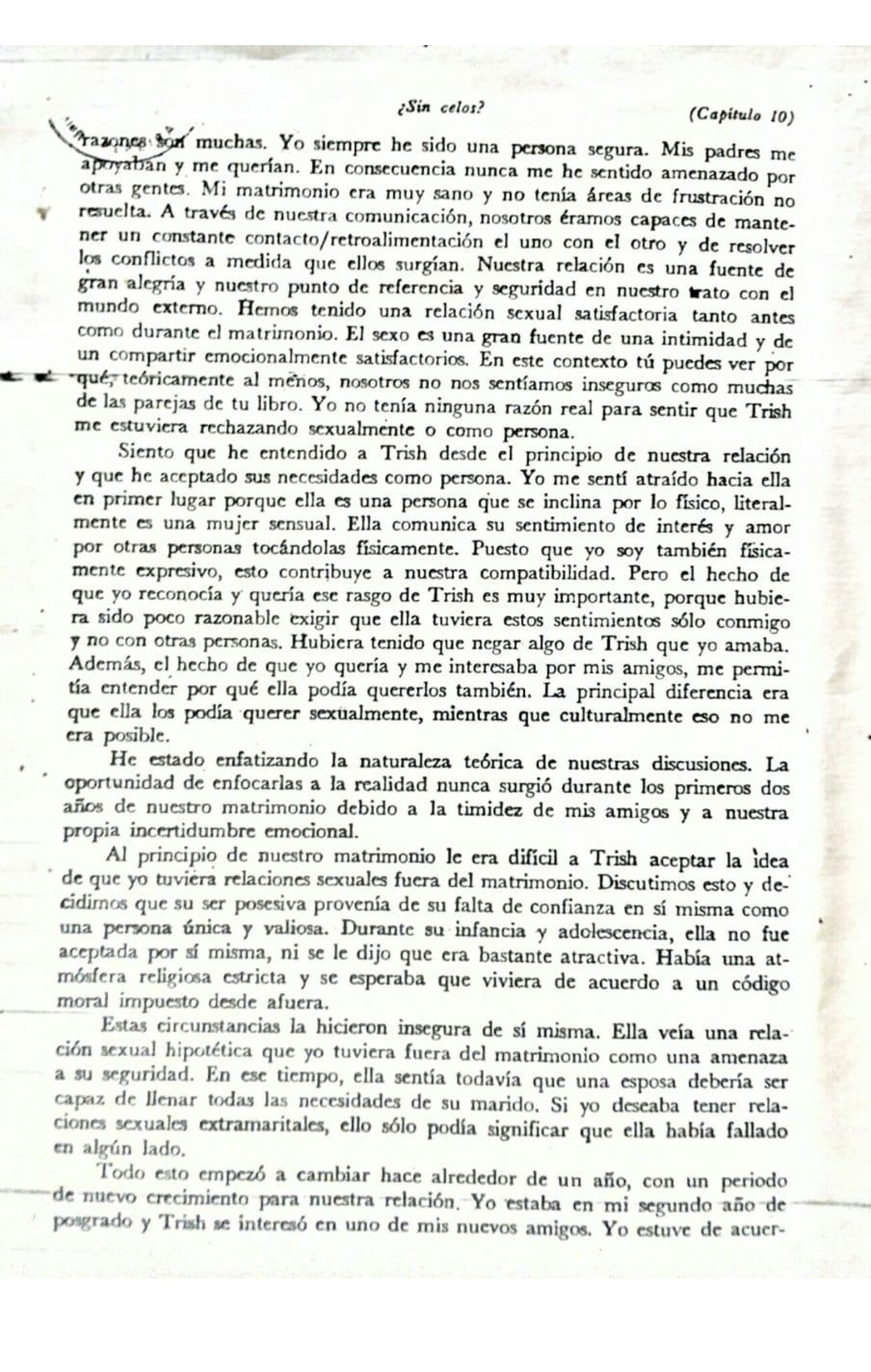 No veo como positiva la relación abierta de Fred y Trish, ya que la situación es bastante intrigante por las conducta suicida de Fred, aunque el diga “Yo debería platicar también algo acerca de los tiempos dolorosos e inseguros. El año pasado todos pasamos una situación traumática” página 150 donde el culpaba una calamidad que a afecto a los cuatro integrantes de la relación, claro está no veo esta muerte ni sus frustraciones con la tesis para llegar a un comportamiento suicida, lo que me hace pensar es que a Fred se le salió de las manos la relación porque su esposa Trish veía a Chip y a Fred como relaciones principales y los amaba por igual pero Fred veía a Trish como su amor principal y a Janet como a su amor segundario, la gran discusión es que Fred se empezó a sentir inseguro.