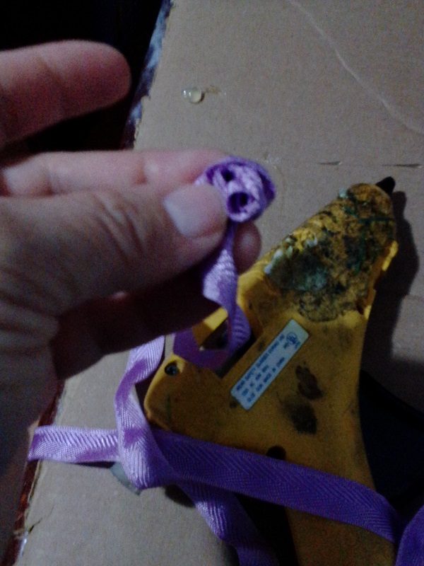 En éste paso comencé el trabajo con mi fiel, sucia y fea pistola de silicon; con ella armo las flores que hago con las cintas y armo los lazos y los cintillos; aquí te muestro cómo realicé la flor morada. Tomé una punta de la cinta y coloqué un punto de pega, doblé para lograr un pequeño triángulo el cual sería el centro de la flor, a partir de allí comencé a dar vueltas alrededor entorchando la cinta, como quería una flor grande utilicé un metro de cinta aproximadamente.